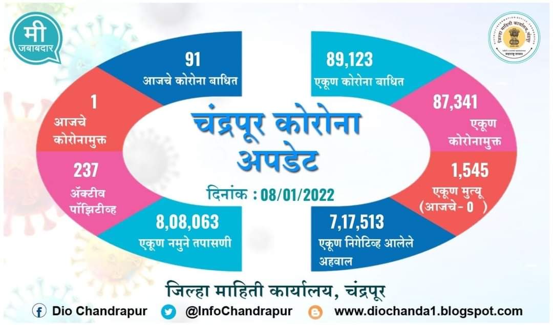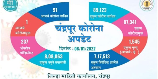 चंद्रपूर, दि. 8 जानेवारी : चालू आठवड्यात कोरोनाबाधितांच्या रुग्णसंख्येत लगातार वाढ होत असून जिल्ह्यात ॲक्टीव्ह रुग्णांची संख्या दोनशेच्या वर पोहचली आहे. गत 24 तासात जिल्ह्यात एकाने कोरोनावर मात केली असून त्या रुग्णाला रुग्णालयातून सुटी देण्यात आली. तसेच 91 नवीन रुग्ण बाधीत झाले आहे. जिल्ह्यात शनिवारी मृत्यू संख्या शून्य आहे.
