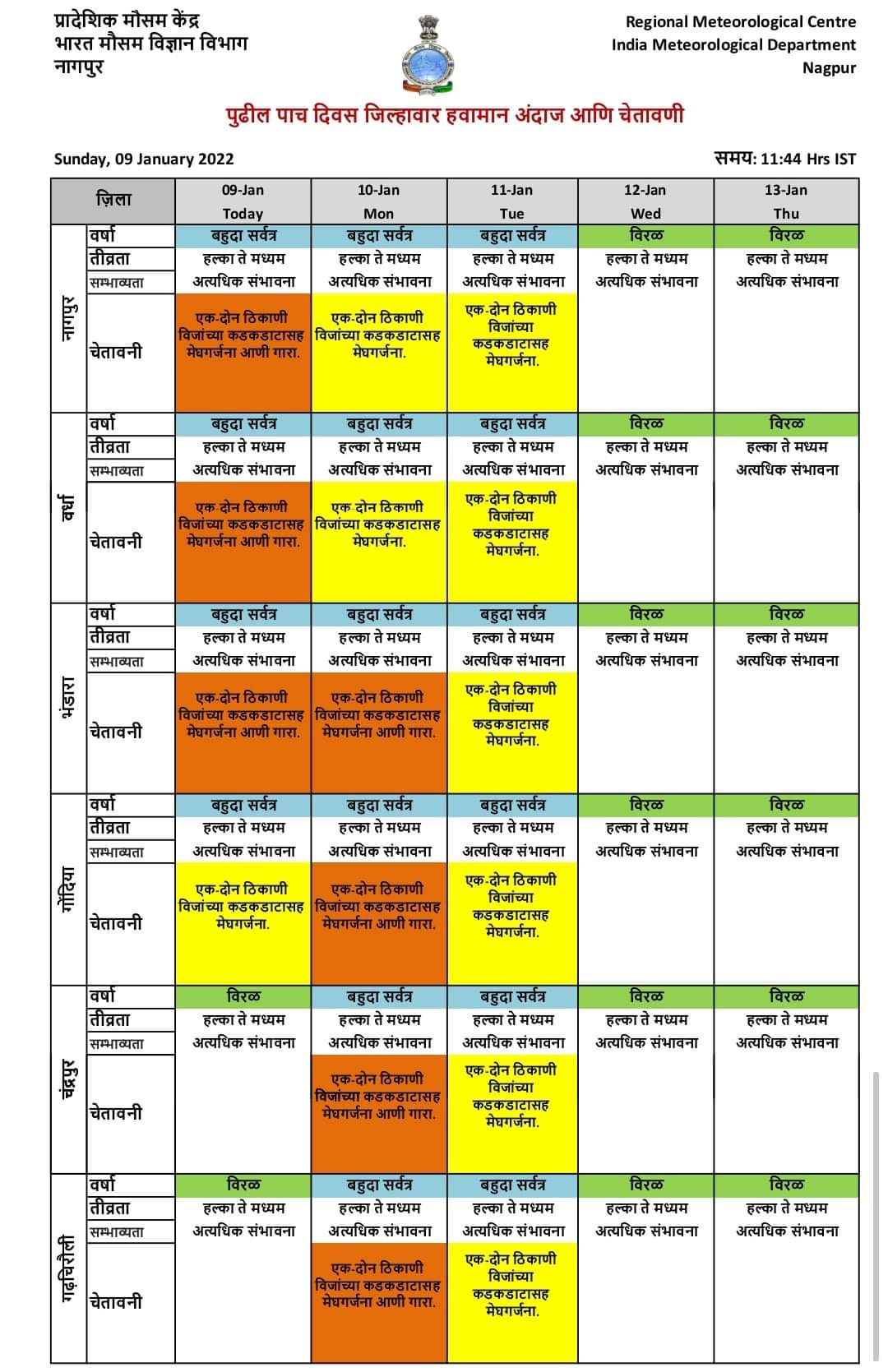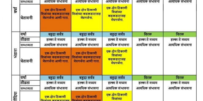 चंद्रपूर, दि. 9 जानेवारी: मुंबई, प्रादेशिक हवामानशास्त्र केंद्राने दिलेल्या सूचनेनुसार दि. 10 व 11 जानेवारी 2022 रोजी दोन दिवसासाठी चंद्रपूर जिल्ह्यासाठी ऑरेंज व यलो अलर्ट जारी केला आहे. त्यानुसार 10 जानेवारी रोजी जिल्ह्यात बहुतांश ठिकाणी हलका ते मध्यम स्वरूपाचा पाऊस पडण्याची शक्यता वर्तविली आहे. तसेच जिल्ह्यातील एक ते दोन ठिकाणी वादळी विजेच्या कडकडाटासह व मेघगर्जनेसह गारा पडण्याची शक्यता वर्तविली आहे. तर 11 जानेवारी रोजी जिल्ह्यात तुरळक ठिकाणी वादळी वारे, विजेचा कडकडाट व ढगांच्या गडगडाटासह पाऊस पडण्याची शक्यता वर्तविण्यात आली आहे.