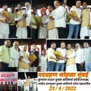 चिमूर:-दिनांक.२३/०४/२०२२ ला महाराष्ट्र प्रदेश युवक काँग्रेस पदग्रहन समारंभ २०२२ कार्यक्रम मुंबई येथे आयोजित करण्यात आले.यावेळी युवक काँग्रेसचे राष्ट्रीय अध्यक्ष श्रीनिवास यांचे उपस्थित महाराष्ट्र प्रदेश युवक काँग्रेसचे अध्यक्ष कुणालदादा राऊत आणि महाराष्ट्र प्रदेश महासचिव म्हणून साईश सतिश वारजुकर यांचा मुबंई येथील टिळक भवन येथे हजारोंच्या संख्येने उपस्थित युवक काँग्रेसचे कार्यकर्ते व पदाधिकारी यांचे उपस्थितीत हा पदग्रहण सोहळा कार्यक्रम संपन्न झाला.