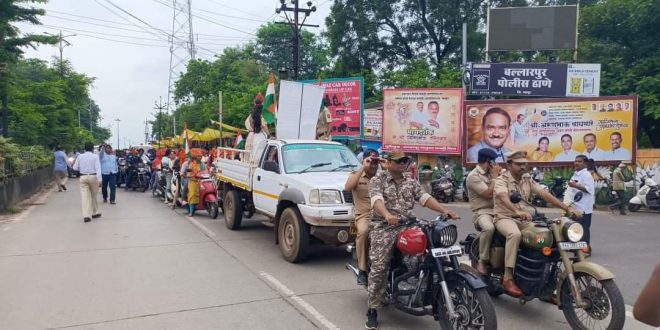 चंद्रपूर, दि. 7 ऑगस्ट : स्वातंत्र्याचा अमृत महोत्सव निमित्ताने बल्लारपूर पोलिस स्टेशन अंतर्गत तहसील कार्यालय, पोलिस विभाग व श्री संत गाडगेबाबा वाचनालय यांच्या संयुक्त विद्यमाने मोपेड तिरंगा ध्वज रॅलीचे आयोजन करण्यात आले.