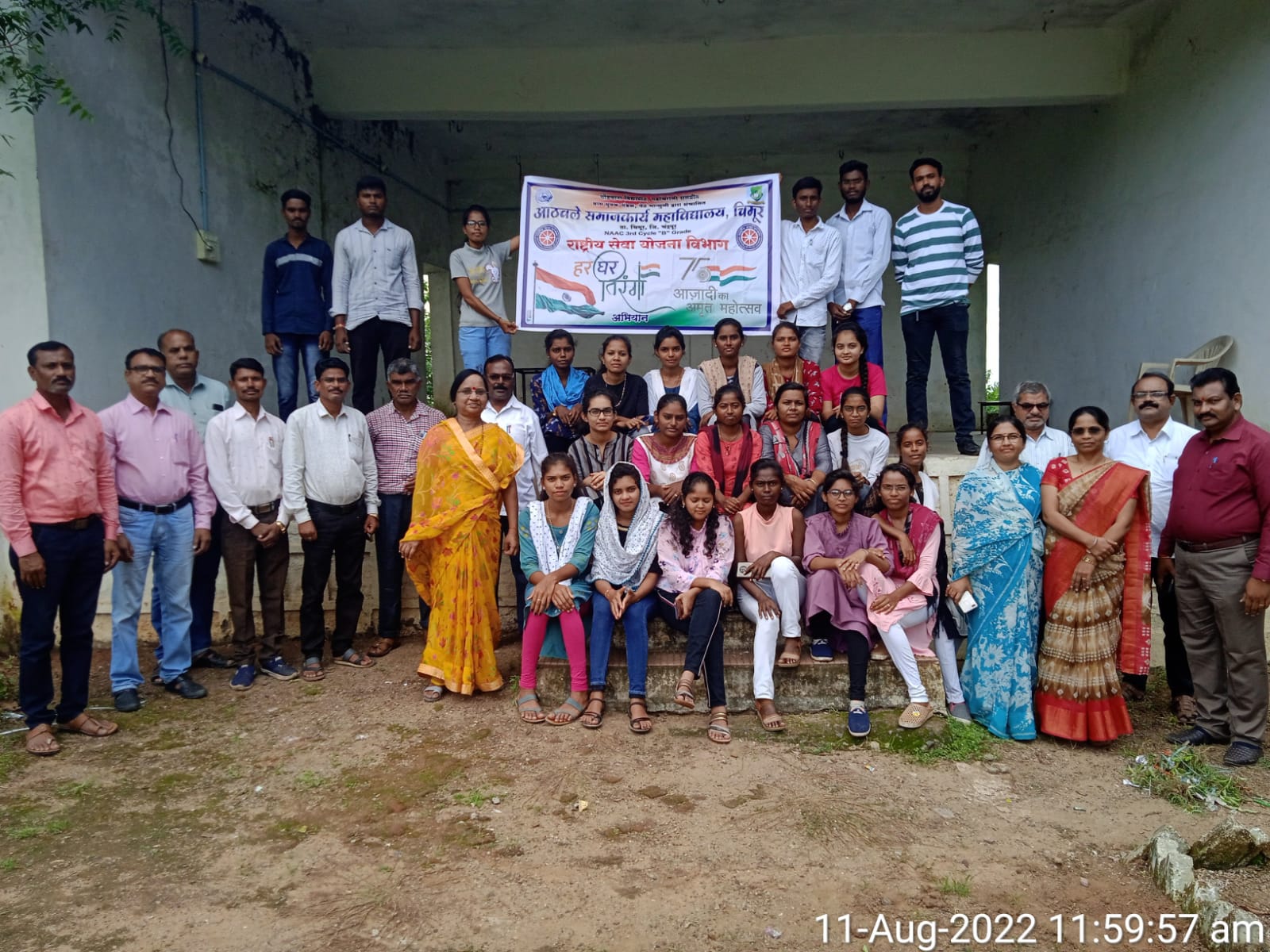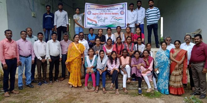 चिमूर:- आज दिनांक १२ ऑगस्ट २०२२ ला आठवले समाजकार्य महाविद्यालय, चिमूर येथे स्वातंत्र्याचा अमृतमहोत्सव निमित्ताने ‘हर घर तिरंगा’ अभियानांतर्गत महाविद्यालयामध्ये राष्ट्रीय सेवा योजना विभागामार्फत विविध कार्यक्रमांचे आयोजन करण्यात आले. यामध्ये परिसर स्वछता, जनजागृतीपर रॅली, व्याख्यानमाला आणि वृक्षारोपण असे विविध कार्यक्रमांचे आयोजन करण्यात आले. परिसर स्वच्छतेमध्ये महाविद्यालय परिसर प्लास्टिक मुक्त करणे, कचरा साफ करणे, झाडू मारणे, ध्वजस्तंभाजवळील परिसर स्वच्छ करणे इत्यादी कामे करण्यात आली,