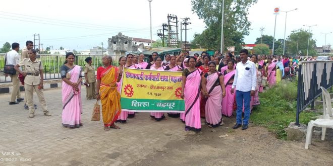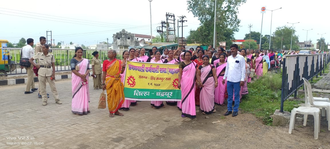 कोरोणा काळात कशाची ही तमा न बाळगता अविरत सेवा देनाऱ्या सरकारच्या प्रत्येक कार्यात सहभाग घेनाऱ्या अंगणवाडी ताई महागाईने भरडल्या आहेत ताईकडे कोनी लक्ष दयायला तयार नाहीत त्यामुळे निराश अंगणवाडी ताई कर्मचारी यांनी केंद्र सरकार व राज्य सरकार विरोधात विवीध मागन्यासाठी मोर्चा एकात्मीक बाल विकास प्रकल्प कार्यालयावर काढला मोर्चा चे रूपांतर सभेत झाले, अंगणवाडी कर्मचारी सभाचे कार्याध्यक्ष इमरान कुरेशी, माधुरी रमेश विर इंदिरा आत्राम चिमुर प्रभा विश्वनाथ चामटकर सीतारा शेख नागभीड लता राजु देवगडे भद्रावती ललीता सोनुले सिंधुताई मद्दावार मुल विद्या वारजुकर दामिनी दोनाडकर ब्रम्हपुरी कमल बारसागडे शोभा मेश्राम सिंदेवाही अन्नपुर्णा हिरादेवे सुनिता कुंभारे वरोरा यांनी अंगणवाडी ताई विषयी मनोगत व्यक्त केले.