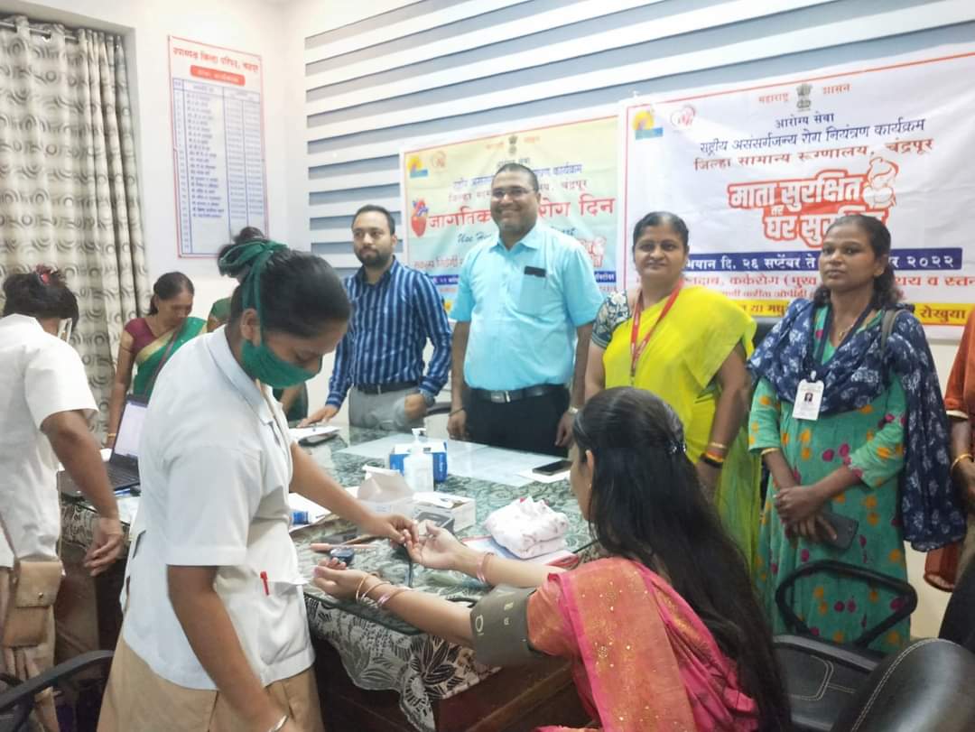 चंद्रपूर, दि. 1 ऑक्टोबर: “माता सुरक्षित तर घर सुरक्षित” या अभियानांतर्गत जिल्हा परिषद, चंद्रपूर येथे प्रभारी मुख्य कार्यकारी अधिकारी वर्षा गौरकार यांच्या मार्गदर्शनात मा.सा. कन्नमवार सभागृहात जिल्हा परिषद चंद्रपूर येथे विविध विभागात कार्यरत महिला अधिकारी व कर्मचारी यांची आरोग्य तपासणी करण्यात आली.  यावेळी, शिक्षणाधिकारी (माध्य.) कल्पना चव्हाण, जिल्हा आरोग्य अधिकारी डॉ. राजकुमार गहलोत, प्रियंका रायपुरे, डॉ. ढवस, डॉ. ऋतुजा मुंधडा, डॉ. दीप्ती श्रीरामे, डॉ. प्राची मेहुलकर, डॉ. माधुरी मेश्राम, डॉ. मिना मडावी, डॉ.अमित जयस्वाल आदी प्रामुख्याने उपस्थित होते.