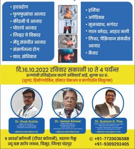 तरी या संधीचा फायदा घेत जनसामान्यांनी स्वतःची व स्वतःच्या प्रियजनांची तपासनी करून व मार्गदर्शन घेऊन आरोग्य बळकट करावे असे आवाहन संस्थेचे डॉ. सुशांत पिसे यांनी केले आहे अधिक माहिती तथा नोंदणी साठी ९३०९२९२४०५ ,७७२००३६५८८ही भ्रमणध्वनी क्रमांक दिलेली आहेत.