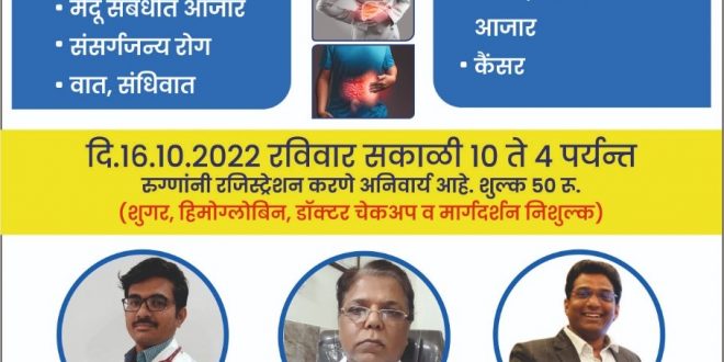 दि २१ ऑक्टो.२२ शुक्रवार ला असाध्य आजरांवर होमियोपैथी चिकित्सा द्वारे चिकित्सा करण्यात येणार आहे,