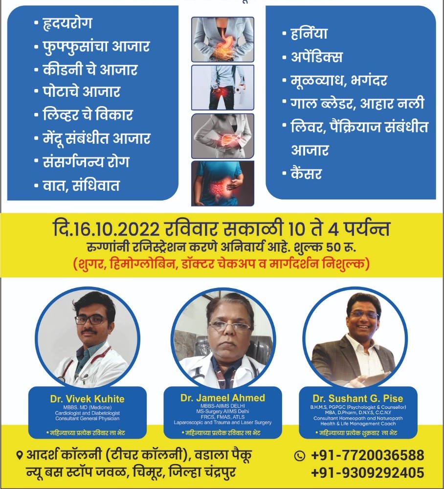 येणाऱ्या १६ ऑक्टो. २०२२ रोज रविवारला स. १० ते सा. ४ वाजेपर्यंत इनार्च मल्टीस्पेशालिस्ट क्लिनिक आदर्श कॉलनी (टीचर कॉलनी ) वडाळा पैकु, न्यु बस स्टॉप जवळ, चिमूर येथे हेल्थ चेकउप शिबिराचे आयोजन केले आहे ,फक्त रु. ५० ची फि आकारून रजिस्ट्रेशन करून रुग्नांना शुगर, हिमोग्लोबीन, डॉक्टर विवेक कुहीटे हृदय रोग व शुगर विशेषज्ञ नागपुर डॉ जमील अहमद प्रसिद्ध सर्जन नागपुर चेकअप व मार्गदर्शन करणार आहे.