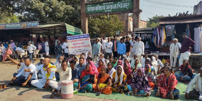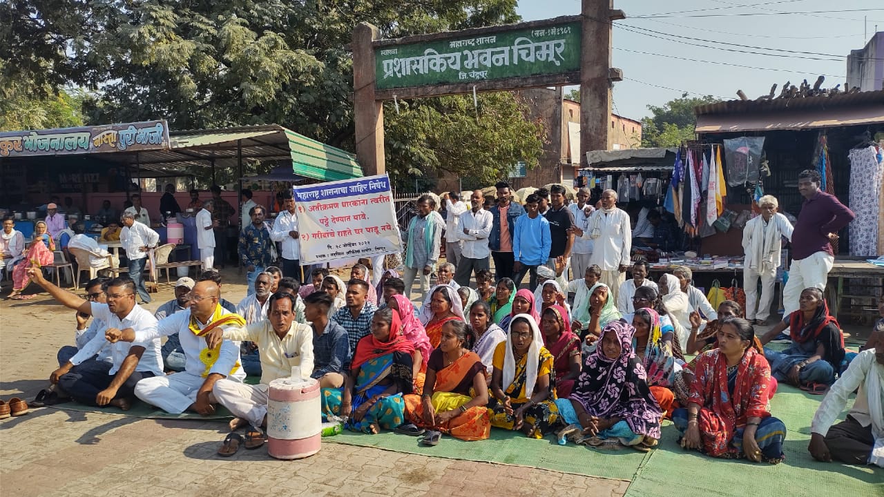 चिमूर:- आज दिनांक २८/११/२०२२ ला चिमूर येथे अतिक्रमण धारकांना सरकारी गायरान जमिनीवरील केलेले निवासी अतिक्रमण काढने बाबत ,आंबोली, शंकरपूर, गदगाव, पिटीचुवा ,काग, शेडेगाव अशा अनेक गावातील नागरिकांना तहसील कार्यालय चिमूर येथून घरे पाडण्याकरीता नोटीस पाठवली असता आज तहसील कार्यालय चिमूर समोर डॉ. सतिश भाऊ वारजुकर यांच्या नेतृत्वाखाली धरणे आंदोलन करण्यात आले व अतिक्रमण धारकांना त्वरित पट्टे देण्यात यावे व त्यांच्यावर केलेली कार्यवाही थांबवावी या साठी निवेदन देण्यात आले.