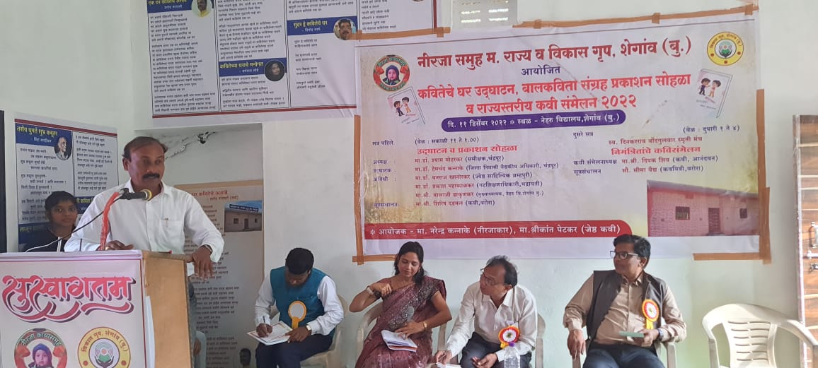 चंद्रपूर:-नीरजा समूह महाराष्ट्र राज्य व विकास गृप शेगाव बुज यांच्या संयुक्त विद्यमाने आयोजित ‘ कवितेचे घर उद्घाटन सोहळा, बाल कविता संग्रह व निमंत्रित कवींचे कवी संमेलन असा बहारदार तिहेरी सोहळा शेगाव येथे संपन्न झाला.उद्घाटक डॉ. हेमचंद गुरुदास कन्नाके,जिल्हा निवासी वैद्यकीय अधिकारी, चंद्रपूर तर अध्यक्ष म्हणून डॉ. श्याम मोहरकर,समीक्षक चंद्रपूर अतिथी डॉ. प्रकाश महाकाळकर,गट शिक्षणाधिकारी, भद्रावती, बालाजी ढाकुणकर,मुख्याध्यापक नेहरू विद्यालय प्रामुख्याने उपस्थित होते. कार्यक्रमाची सुरुवात नंदिनी कन्नाके लिखित नीरजा स्वागत गीताने झाले. डॉ. हेमचंद कन्नाके यांनी फित कापून कवितेच्या घराचे उद्घाटन केले. प्रास्ताविक भाषणात नीरजा समूह प्रशासक नरेन्द्र कन्नाके यांनी 2017 पासून अविरत सुरू असलेले नीरजा समूह व विविध उपक्रम यावर प्रकाश टाकला. कविसंमेलन मुळे जगण्यात विविधता व नावीन्यपूर्ण जीवन होते.कवीच्या अंतकरणातून निघणारी अलंकारिक शब्दरचना म्हणजे कविता असे उद्घाटक डॉ. हेमचंद कन्नाके यांनी व्यक्त केले. प्रमुख अतिथी डॉ. प्रकाश महाकाळकर यांनी शैक्षणिक व साहित्यिक विषयावर वेगवेगळे उदाहरणाच्या माध्यमातून आपले भाव स्पष्ट केले.