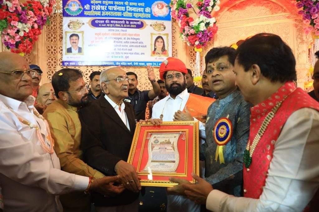 ठाणे: ठाणे शहरातील श्री राजस्थान श्वेतांबर मूर्तिपूजक संघ ठाणे शहर यांच्यावतीने आयोजित करण्यात आलेल्या श्री शंखेश्वर पार्श्वनाथ मंदिराच्या भव्यतीभव्य अंजनशलाका प्राणप्रतिष्ठा महामहोत्सवाला मुख्यमंत्री एकनाथ शिंदे उपस्थित राहून मनोभावे दर्शन घेतले तसेच जैन बांधवांना शुभेच्छा दिल्या.