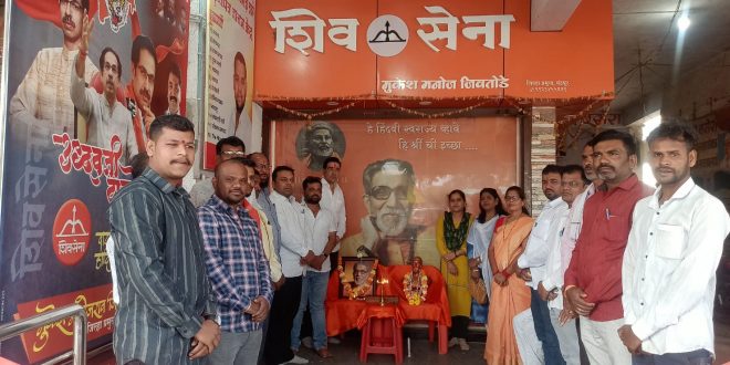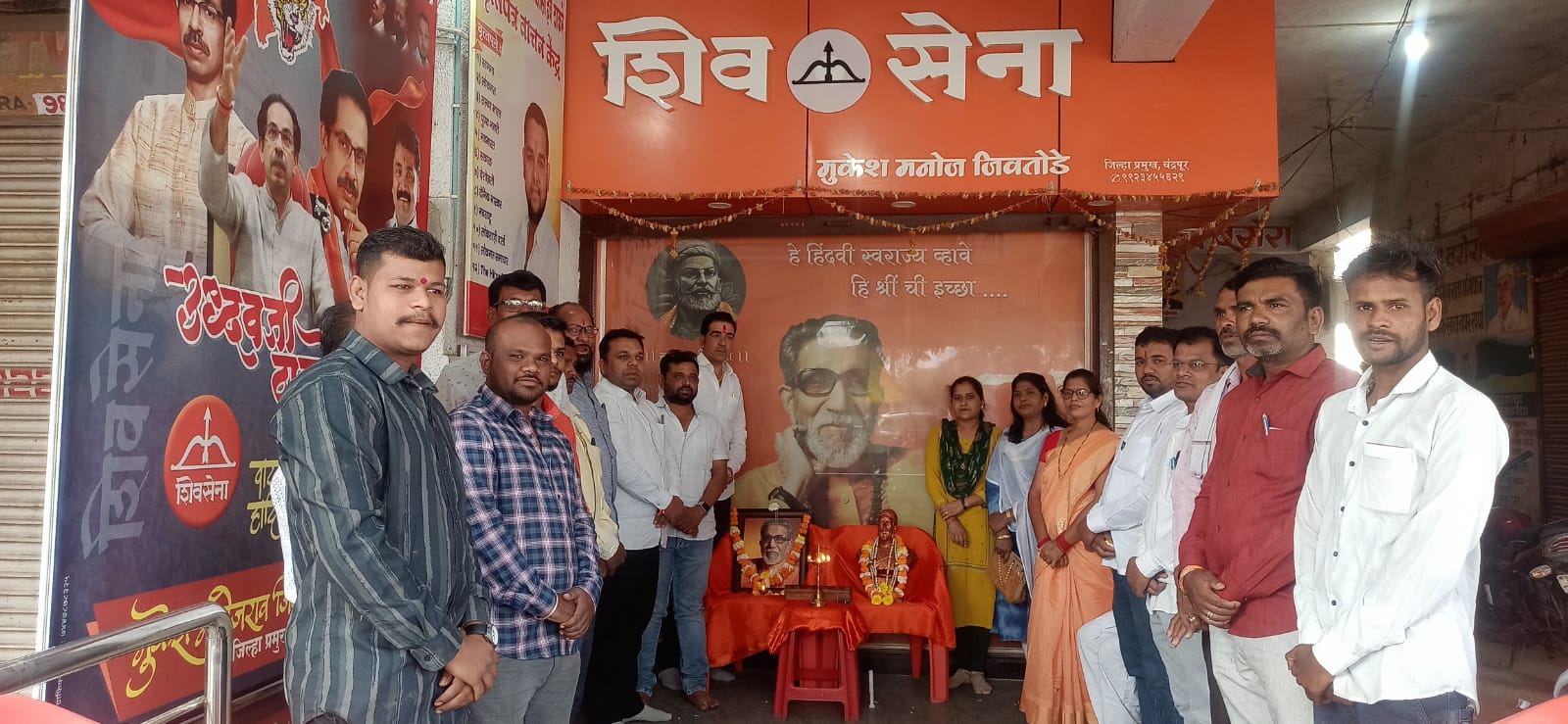 चंद्रपूर:- स्वराजनिर्माते छत्रपती शिवाजी महाराज यांना वंदन करुन, शिवसेना (उद्धव बाळासाहेब ठाकरे )जिल्हाप्रमुख चंद्रपूर मुकेश जिवतोडे यांच्या मार्गदर्शनाखाली ,शिवसेना जिल्हा कार्यालय वरोरा व शिवसेना तालुका कार्यालय भद्रावती येथे हिंदुहृदयसम्राट शिवसेनाप्रमुख बाळासाहेब ठाकरे यांच्या जयंतीनिमित्त दीप प्रज्वलन करुन,पुष्पहार घालुन विनम्र अभिवादन करण्यात आले.त्यावेळी बाळासाहेब अमर रहे, जय भवानी जय शिवाजी अश्या घोषणा देण्यात आल्या.