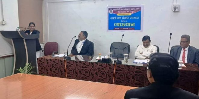 चंद्रपूर,दि. 24 : जिल्हा विधी सेवा प्राधिकरण, चंद्रपूर आणि जिल्हा वकील संघ चंद्रपूर यांच्या संयुक्त विद्यमाने मराठी भाषा संवर्धन पंधरवडानिमित्त जिल्हा न्यायालयात व्याख्यानाचे आयोजन करण्यात आले. कार्यक्रमाच्या अध्यक्षस्थानी प्रमुख जिल्हा व सत्र न्यायाधीश समृद्धी भीष्म तर प्रमुख वक्ते म्हणून गोंडपिपरी येथील कला व वाणिज्य महाविद्यालयाचे निवृत्त प्राचार्य डॉ. श्याम मोहरकर उपस्थित होते.