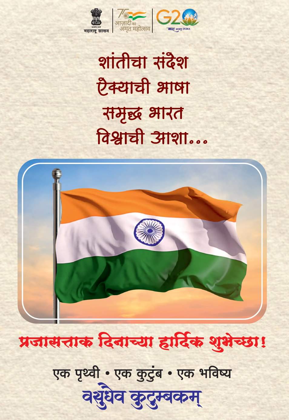 चंद्रपूर, दि. 25 : भारतीय प्रजासत्ताक दिनाच्या 73 व्या वर्धापन दिन समारंभानिमित्त ध्वजारोहणाचा मुख्य शासकीय कार्यक्रम राज्याचे वने, सांस्कृतिक कार्य व मत्स्यव्यवसाय मंत्री तथा जिल्ह्याचे पालकमंत्री सुधीर मुनगंटीवार यांच्या शुभहस्ते गुरुवार, दि. 26 जानेवारी रोजी सकाळी 9.15 वाजता पोलिस मैदान, पोलिस मुख्यालय, चंद्रपूरच्या प्रांगणात संपन्न होणार आहे, असे जिल्हा प्रशासनामार्फत कळविण्यात आले आहे.