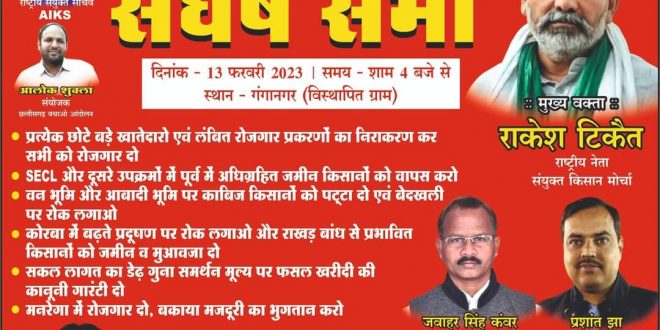 कोरबा। कल 13 फरवरी को कोरबा जिले के बांकी मोंगरा क्षेत्र के गंगानगर गांव में छत्तीसगढ़ किसान सभा द्वारा आयोजित ‘विस्थापन पीड़ितों की संघर्ष सभा’ को संयुक्त किसान मोर्चा के नेता राकेश टिकैत, अखिल भारतीय किसान सभा के संयुक्त सचिव बादल सरोज, बीकेयू के महासचिव राजवीर सिंह जादौन, भूमि अधिकार आंदोलन से जुड़े छत्तीसगढ़ बचाओ आंदोलन के संयोजक आलोक शुक्ला, छत्तीसगढ़ किसान सभा के सचिव ऋषि गुप्ता तथा सीटू नेता वी एम मनोहर सहित कई स्थानीय नेता संबोधित करेंगे। केंद्र और राज्य सरकार की गांव-गरीब और आदिवासी-किसान विरोधी नीतियों के खिलाफ आयोजित हो रही इस सभा की तैयारियां पूरी हो चुकी है।