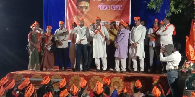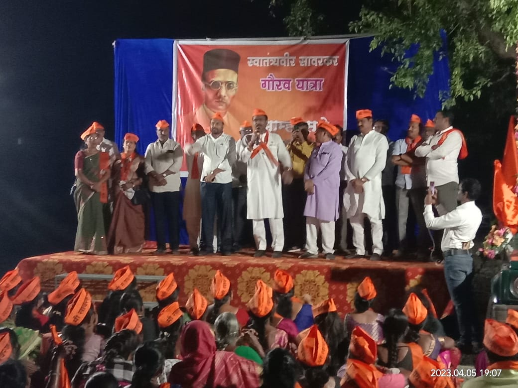 चिमूर:-भारतीय जनता पार्टीच्या वतीने राज्यभरात स्वातंत्रवीर सावरकर गौरव यात्रा काढण्यात येत आहे. दिनांक 5 एप्रिल 2023 रोजी चिमूर येथे भारतीय जनता पार्टीच्या वतीने सायंकाळी 6 वाजता गौरवयात्रा काढण्यात आली.चिमूर विधानसभा क्षेत्राचे आमदार कीर्तीकुमार भांगडिया यांचे नेतृत्वात नेहरू विद्याल्य चिमूर येथून सायंकाळी सहा वाजता स्वातंत्रवीर सावरकर यात्रेला सुरुवात करण्यात आली. शहरातील शहीद बालाजी रायपूरकर चौक, मार्केट लाईन. छत्रपती शिवाजी महाराज चौक ते नेहरू चौक मार्गे भारत माता की जय. वंदे मातरम्. स्वातंत्रवीर सावरकर यांचा विजय असो या घोषणा देण्यात आल्या. गौरव यात्राची सांगता हुतात्मा स्मारक चिमूर येथे करण्यात आली.