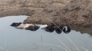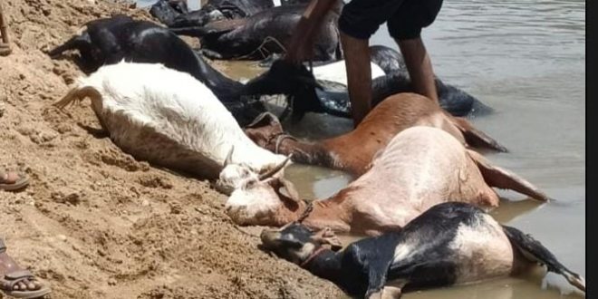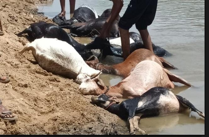 चिमूर : – चिमूर तालुक्यातील जांभुळघाट जवळील बोळधा नदी पात्रात JCB च्या सहाय्याने खड्डा करून त्याठिकाणी मोटारपंप लावून शेतीला पाणी करीत असतांना इलेक्ट्रिकची वायर लिकेज असल्याकारणाने पाण्यात विद्युत प्रवाह निर्माण होऊन ९ बकऱ्या २ बकरे जागीच ठार झाले.अशी ही दुर्दैवी घटना घडली.हि शेती कापगते यांची असून तेच शेतीला पाणी करीत होते. हि घडलेली घटना दिनांक १७ जून २०२३ ला सकाळी ११ वाजताच्या दरम्यान ची आहे.