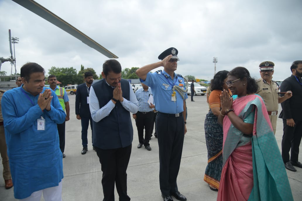राष्ट्रपती द्रौपदी मुर्मू यांच्या स्वागतासाठी यावेळी राज्यपाल रमेश बैस,केंद्रीय मंत्री नितीन गडकरी,उपमुख्यमंत्री देवेंद्र फडणवीस, एअरमार्शल विभास पांडे, मेजर जनरल एस. के. विद्यार्थी, विभागीय आयुक्त विजयलक्ष्मी बिदरी,पोलीस आयुक्त अमितेश कुमार, जिल्हाधिकारी डॉ.विपिन इटनकर, पोलीस अधीक्षक विशाल आनंद उपस्थित होते. एक वाजता त्या नागपूरला पुन्हा पोहोचणार असून चार वाजता कोराडी येथील कार्यक्रमात उपस्थित राहणार आहेत.