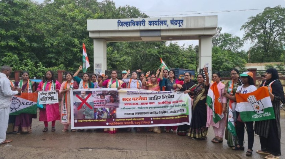 मणिपूर आणि केंद्र सरकारचा जाहीर निषेध करण्यासाठी चंद्रपूर जिल्हा महिला काँग्रेस व ग्रामीण, चंद्रपूर राष्ट्रवादी काँग्रेस महिला आघाडी, शिवसेना उद्धव बाळासाहेब ठाकरे, महिला आघाडीच्या संयुक्त विद्यमाने स्थानिक जिल्हाधिकारी कार्यालयासमोर आंदोलन करण्यात आले. यावेळी जिल्हाधिकारी विनय गौडा(जी.सी.) यांना संयुक्त निवेदन देण्यात आले.