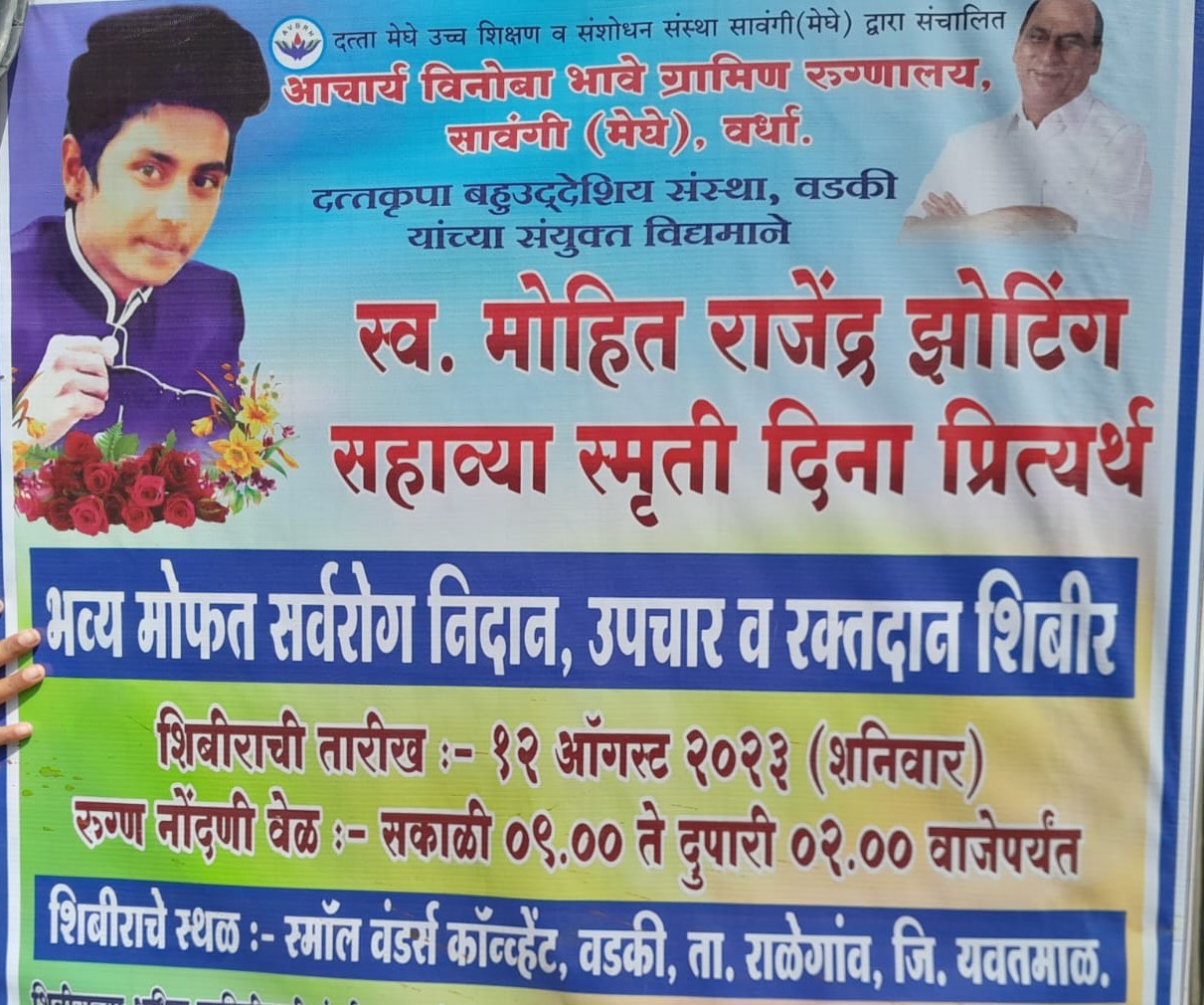 यवतमाळ:-यवतमाळ जिल्ह्यातील राळेगाव तालुका अंतर्गत येत असलेल्या वडकी येथे दत्तकृपा बहुउद्देशीय संस्था वडकी व आचार्य विनोबा भावे ग्रामीण रुग्णालय सावंगी मेघे वर्धा यांच्या संयुक्त विद्यमाने स्व. मोहित राजेंद्र झोटींग यांच्या सहाव्या स्मृतिदिनानिमित्त भव्य रोगनिदान, उपचार व रक्तदान शिबिराचे आयोजन दिनांक १२ऑगस्ट रोजी स्मॉल वडर कान्व्हेंट वडकी येथे करण्यात आले.सामाजिक कार्यकर्ते राजेंद्र झोटींग हे दरवर्षी स्व. मोहीत यांच्या स्मृतिदिनानिमीत्य सामाजिक जाणिवेतून सामाजिक उपक्रम राबवित असतात. स्व मोहित यांचे सहा वर्षांपूर्वी आजाराने निधन झाले.