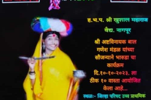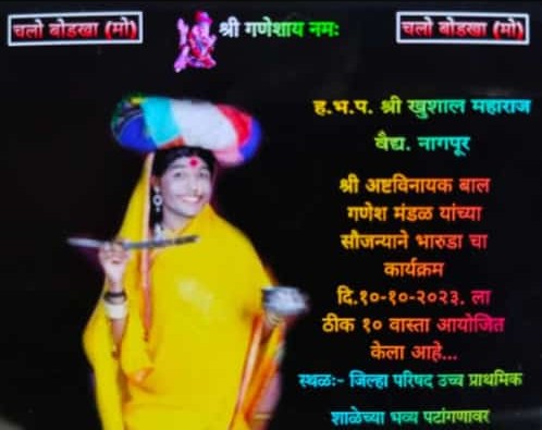 वरोरा:-वरोरा तालुक्यातील बोडखा मोकाशी येथे यावर्षी एक गाव एक सार्वजनिक गणपती असा आदर्श ठेऊन अष्टविनायक बाल गणेश मंडळ यांच्या सौजण्याने, नागपूर येथील प्रसिद्ध विनोदी भारूड करणारे हरी भक्त पारायण श्री खुशाल महाराज यांचे भारूड चे आयोजन दिनांक 10/10/2023 रोज मंगळवारला संत गजानन महाराज मंदिर बोडखा मोकाशी येथे सायंकाळी 9वाजता करण्यात आले आहे तरी समस्त भाविक भक्तांनी भारूड चा आनंद घेण्यासाठी यावे अशी सूचना अष्टविनायक गणेश बाल मंडळ बोडखा यांनी केले आहे.