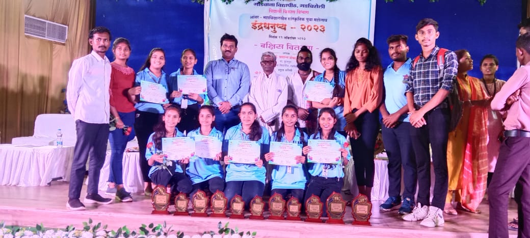चंद्रपूर/चिमूर:-ग्रामगीता महाविद्यालय, चिमूर येथील विद्यार्थ्यांनी गोंडवाना विद्यापीठ गडचिरोली मध्ये दिनांक 17-10- 2023 ते 19-10-2023 दरम्यान आयोजित केलेल्या विद्यापीठ स्तरीय इंद्रधनुष्य-2023 स्पर्धेमध्ये संपूर्ण विद्यापीठात सगळ्यात जास्त तब्बल बारा पारितोषिक जिंकत जोरदार यश प्राप्त केले आहे. महाविद्यालयातील विद्यार्थ्यांनी इंद्रधनुष्य-2023 मध्ये विविध स्पर्धेत सहभाग नोंदवला होता.