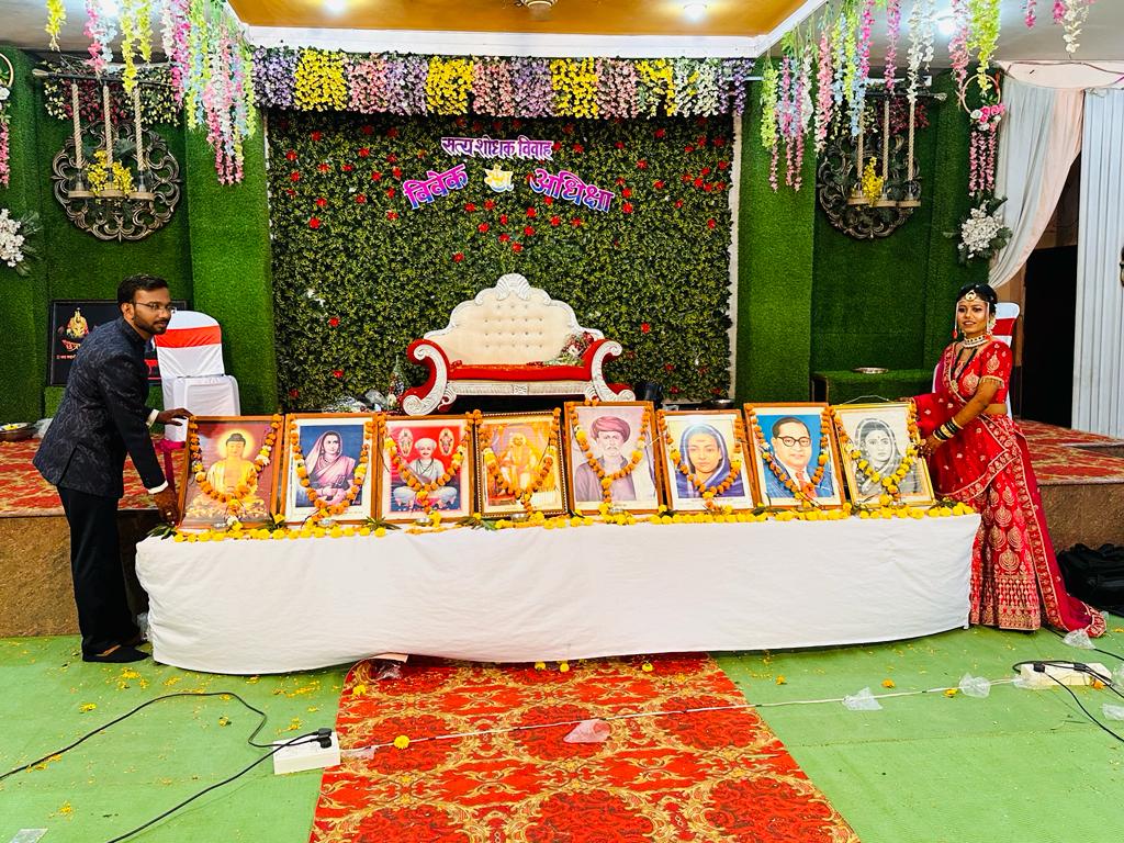 सर्वप्रथम तथागत गौतम बुद्ध,राष्ट्रमाता जिजाऊ,जगतगुरु तुकोबाराय,रयतेचे राजे शिवाजी महाराज,महात्मा ज्योतिबा फुले,क्रांतिज्योती सावित्रीआई फुले,राजर्षी शाहू महाराज,भारतीय राज्य घटनेचे शिल्पकार डॉ. बाबासाहेब आंबेडकर,भारतीयांची आई ‘ रमाई ‘ या महामानवांना वर – वधू आणि दोन्हीं कुटुंबियांच्या पालकांनी अभिवादन केले. सत्यशोधक विवाह संपन्न झाल्यानंतर उभयत्यांना प्रबोधनकार राहुल डोंगरे यांनी शपथ दिली.जोडीने समाजाचे,देशाचे, माता पित्याचे ऋण फेडू अशी शपथ घेतली, हे विशेष!