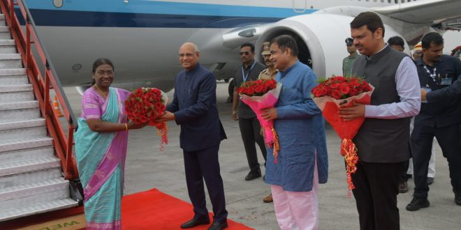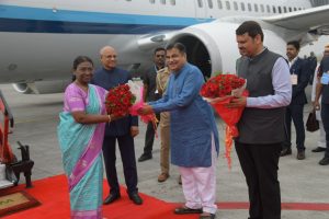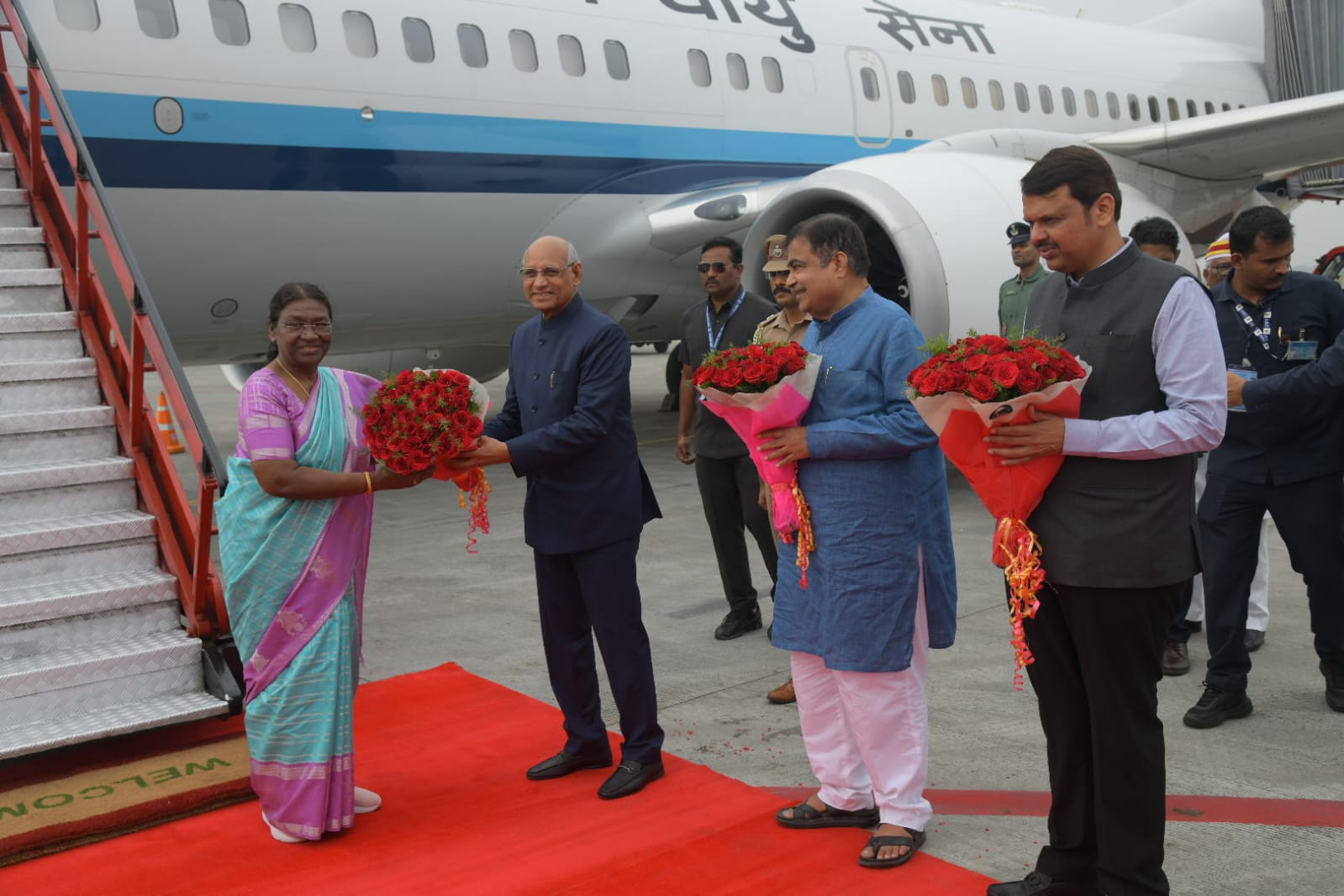 डॉ. बाबासाहेब आंबेडकर आंतरराष्ट्रीय विमानतळावर राष्ट्रपती द्रौपदी मुर्मू यांचे एअर इंडियाच्या विमानाने आगमन झाल्यानंतर त्यांचे भव्य स्वागत करण्यात. यावेळी राज्यपाल रमेश बैस,केंद्रीय मंत्री नितीन गडकरी,उपमुख्यमंत्री देवेंद्र फडणवीस, एअरमार्शल विवेक गर्क, ब्रिगेडिअर राहुल दत्त, विभागीय आयुक्त विजयलक्ष्मी बिदरी,पोलीस आयुक्त अमितेश कुमार, जिल्हाधिकारी डॉ.विपिन इटनकर, पोलीस अधीक्षक हर्ष पोद्दार आदींनी त्यांचे स्वागत केले.