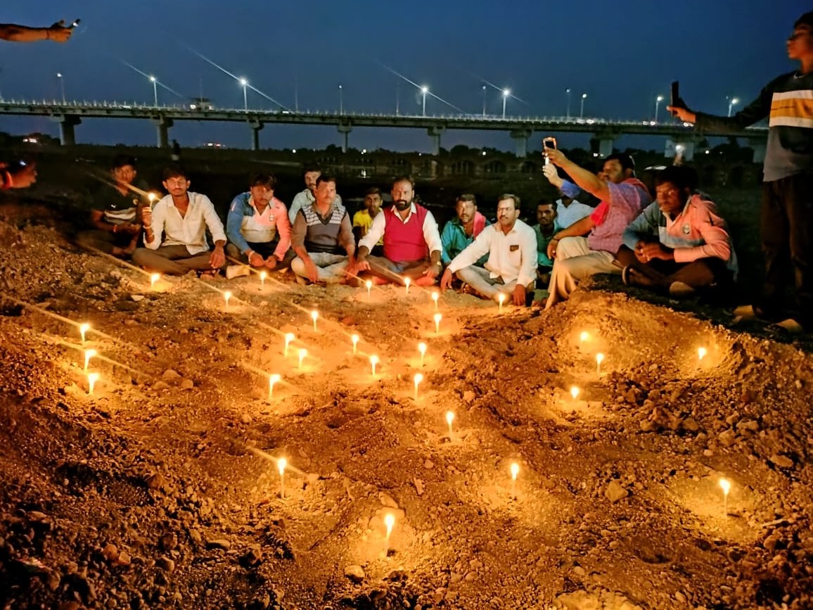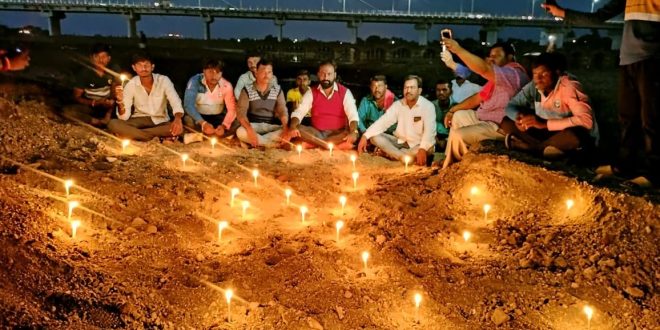 अनोखे आंदोलन केली ह्या मेणबत्त्याकडे बघत बघत तरी चंद्रभागेच्या पात्रामध्ये पडलेल्या खड्ड्यांकडे शासनाने बघावं अशी मागणी आम्ही ह्या माध्यमातून करत आहोत माननीय मुख्यमंत्री उपमुख्यमंत्री सध्या अधिवेशन चालू आहे आमची महर्षी वाल्मिकी संघाच्या वतीने मागणी आहे कि कित्येक गेल्या अनेक वर्षापासून आम्ही वारंवार वाळू चोरी संदर्भात आवाज उठवतोय पण अद्याप पर्यंत चंद्रभागेतली वाळू चोरी थांबवण्यासाठी अधिकाऱ्यांना अपयश आलेला आहे त्यामुळे इथले *प्रांताधिकारी तहसीलदार व संबंधित सर्व अधिकार्याला तात्काळ निलंबित करून त्यांच्यावर कारवाई करावी किंवा त्यांची बदली करावी*अशी मागणी महर्षी वाल्मिकी संघाचे अध्यक्ष गणेश अंकुशराव यांनी केली* कारण हे अधिकारी ह्या पंढरपूर तालुक्यांमध्ये राहिले तर चंद्रभागा बकाल झाल्याशिवाय राहणार नाही त्यामुळे लवकरात लवकर आमच्या मागणीचा शासनाने गंभीर विचार करावा अन्यथा आम्हाला महर्षी वाल्मिकी संघाच्या वतीने तीव्र आंदोलन करावे लागेल.