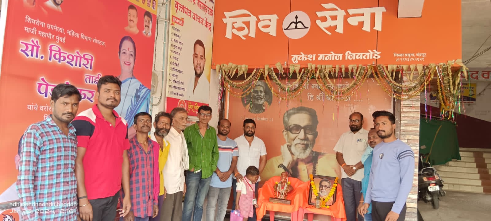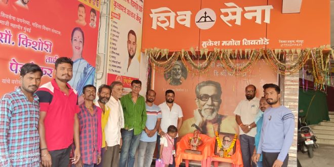 चंद्रपूर:-शिवसेना (उद्धव बाळासाहेब ठाकरे) पक्षाच्या वतीने जिल्हा कार्यालय येथे हिंदूहृदयसम्राट शिवसेनाप्रमुख माननीय बाळासाहेब ठाकरे यांची जयंती जिल्हाप्रमुख मुकेशभाऊ जिवतोडे यांच्या मार्गदर्शनात साजरी करण्यात आली. यावेळी उपस्थित शिवसैनिकांनी बाळासाहेबांच्या प्रतिमेस पुष्पहार अर्पण करुन अभिवादन केले. यावेळी शहर प्रमुख संदीपभाऊ मेश्राम, विधानसभा संघटक सुधाकरभाऊ मिलमिले,जेष्ठ शिवसैनिक अनिलजी गाडगे,उपतालुका प्रमुख मनीष दोहतरे,जेष्ठ शिवसैनिक संजय तलांडे,राजा थैम, अंकित घुगल व समस्त शिवसैनिक उपस्थित होते.