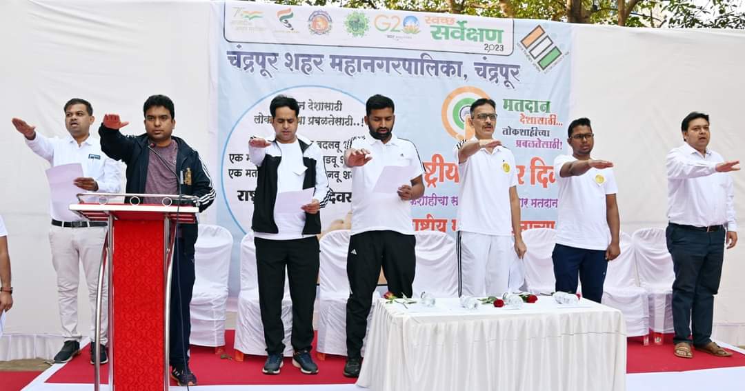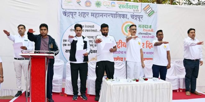 चंद्रपूर:-निवडणूक हा लोकशाहीचा केंद्रबिंदू आहे. राज्यघटनेने आपल्याला मतदानाचा अधिकार दिला आहे. हा अधिकार सर्वांनी निर्भीडपणे बजावून कोणत्याही प्रलोभनाला बळी न पडता आगामी निवडणुकीत मतदान करावे. सुदृढ लोकशाहीसाठी मतदार जागरूक असणे अत्यंत आवश्यक आहे, असे मत जिल्हाधिकारी विनय गौडा यांनी व्यक्त केले. नियोजन सभागृह येथे राष्ट्रीय मतदार दिनानिमित्त आयोजित कार्यक्रमात ते बोलत होते. यावेळी अतिरिक्त जिल्हाधिकारी श्रीकांत देशपांडे, सहाय्यक जिल्हाधिकारी मुरुगानंथम एम., अपर पोलिस अधिक्षक रिना जनबंधू, तहसीलदार विजय पवार, प्रभारी उपजिल्हाधिकारी (निवडणूक) अतुल जताळे, पॅरा ऑलंपिकमध्ये सूवर्ण पदक विजेते व निवडणूक विभागाचे ब्रॅन्ड ॲम्बेसेडर नईमुद्दीन शेख उपस्थित होते.