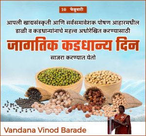 वरोरा:-दिनांक १० फरवरी २०२४ ला उपजिल्हा रुग्णालय वरोरा येथे जागतिक कडधान्य दिन साजरा करण्यात आला.या दिवसाचे काय महत्त्व आहे हे अधोरेखित करणारा दिवस कारण आपली जीवनशैली बदलली आहे खानपान बदलेल आहे.आणी आपण धकाधकीच्या जीवनात जगत आहोत.पाश्चात्य देशातील लोकांनच खानपान आपण अंगिकारले आहे.म्हणुन आज आपण अनेक आजारांना बळी पडत आहोत.ते होवू नये म्हणून हा अधोरेखित करणारा हा दिवस आहे.२०२३ हे कड धान्यं त्रुन धान्यं,भरड धान्य वर्षं म्हणून घोषित झाले.आज आपल्याला जागतिक स्तरावर यांचा निर्णय घ्यावा लागला.कारण आपण आपल्या खांद्य्य संस्कृती ला विसरलो आहोत.आपण ज्या प्रदेशात राहतो.तेथील वातावरणानुसार आपलं खानपान असायला पाहिजे.आणी आपल्या खाद्यसंस्कृती मध्ये भरपूर पोषक असणारे पदार्थ, धान्य, सोडून आपण ते पीज्जा,बर्गर, सारखें पदार्थ खातो आणि आपली तब्येत बीघडवतो.