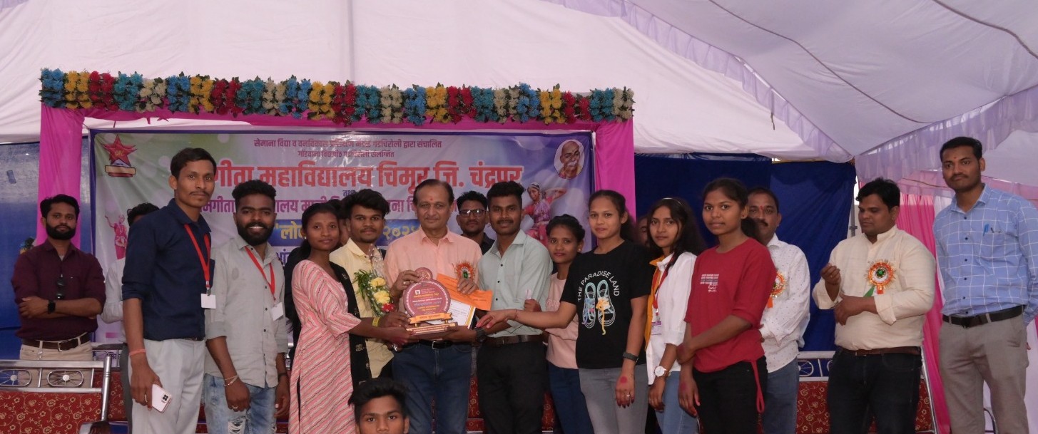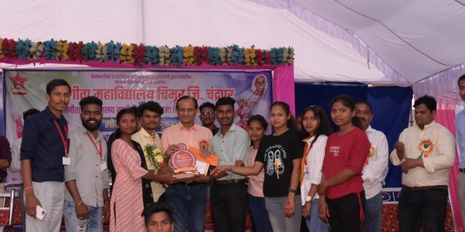 चिमूर:-ग्रामगीता महाविद्यालय व माजी विद्यार्थी संघटना, चिमूर यांच्या संयुक्त विद्यमाने 22 फेब्रुवारी 2024 रोज गुरुवारला लोकनृत्योत्सव 2024 चे आयोजन महाविद्यालयाच्या प्रांगणात करण्यात आले होते. कार्यक्रमाचे उद्घाटन भीष्मराज सोरते, पोलीस उपनिरीक्षक, पोलीस स्टेशन, चिमूर यांच्या हस्ते पार पाडण्यात आले. कार्यक्रमाला अध्यक्ष म्हणून डॉ. अमीर धम्मानी प्राचार्य, ग्रामगीता महाविद्यालय, चिमूर उपस्थित होते. कार्यक्रमाला पाहुणे म्हणून महाविद्यालयाचे प्रा. हुमेश्वर आनंदे, प्रा. संदीप सातव, प्रा. अरुण पिसे, प्रा. नागेश ढोरे व प्रा. समीर भेलावे उपस्थित होते. लोकनृत्योत्सव 2024 मध्ये राज्यातील विविध महाविद्यालयातून 18 संघ सहभागी झाले होते.
