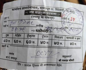अवजड वाहतुकीसाठी प्रशासनाने प्रत्येक ग्रामपंचायतीला परवडणार असे दर ठरवुन दिले आहे परंतु आकारले जाणारे अवजड वाहतूक म्हणजेच प्रवासी वाहतुकीची गाडी वगळता अवजड वाहतुकीची पावती ही माल वाहतुकीसाठी असते. अर्थात ट्रक, पीकप, ट्रॅक्टर, आयवा, टेम्पो अश्या प्रकारचे जिथे माल असतो त्याच गाडीचे प्रशासनाने ठरवुन दिलेल्या दरानुसार, दर आकारले पाहीजे मात्र चंद्रपुर जिल्ह्यात सिंदेवाही तालुक्यातील रत्नापुर ग्रामपंचायत येथे कार,टवेरा, समो, ईतर प्रवासी वाहतुक गाड्याकडुन 100,200, जबरदस्तीने बेकायदेशीर रित्या पैसे वसुलीचा गोरखधंदा चालु आहे. रत्नापुर ग्रामपंचायत नी तयार केलेल्या वसुली पावती मध्ये जड वाहतुक परवाना अस नमुद केला असुन