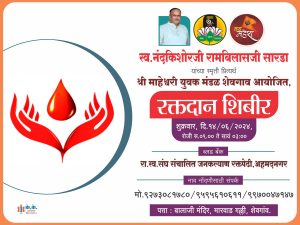 *स्वर्गीय नंदकिशोर सारडा यांनी आपल्या सामाजिक राजकीय आणि वैयक्तिक जीवनामध्ये नेहमीच विविध सामाजिक उपक्रम राबवून समाजातील तळागाळातील लोकांची सेवा केलेली होती कोरोना काळामध्ये शेवगाव शहरातील कोरोना योद्धा म्हणून त्यांची ख्याती होती परंतु दुर्दैवाने कोरोना आजाराने त्यांचा अंत झाला त्यांच्या स्मरणार्थ एक सामाजिक उपक्रम माहेश्वरी युवक मंडळ शेवगाव यांनी रक्तदान शिबिराचे आयोजन केलेले आहे*