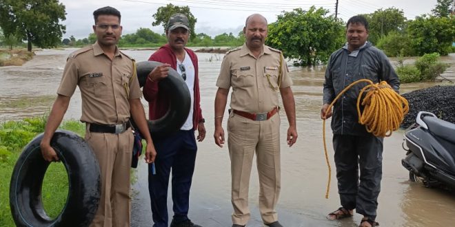 चिमूर :- चिमूर तालुक्यात सतत पडत असलेल्या पावसाने नदी नाले ओसंडून वाहत असून नेरी – तलोधी रोड वरील नदीवरील पुलावरून पाण्याचा अंदाज चुकल्याने चंद्रपूर जिल्हा कों ऑपरेटिव्ह बँक कर्मचारी केशव श्रीरामे नेरी व पिंटू बरडे चिमूर याना सुरक्षित बाहेर काढण्यात पोलिसांना यश आले आहे.