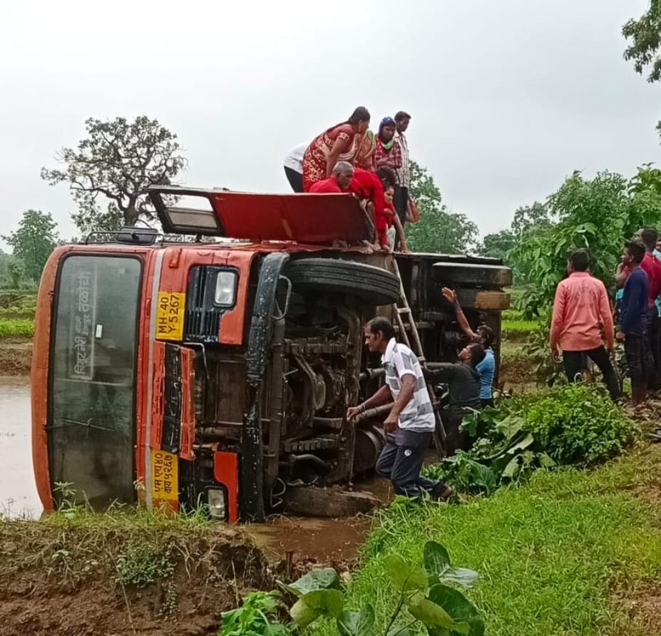 चिमूर : – नेहमी प्रमाणे चिमूर आगाराची बस चिमूर वरून नेरी – वैजापूर -तळोधी मार्गे जात असतांना एसटी महामंडळची बस सोनापूर येणोली माल च्या मधोमध आज दुपारी ०१:०० वाजताच्या सुमारास खराब रस्त्यामुळे MH 40 Y 5267 क्रमांकाची हि बस पलटी झाल्याने या बस मधिल १० ते १२ प्रवासी प्रवास करीत असतांना यामधील कुठल्याही प्रवाशांना दुखापत झाली नसून सर्वच प्रवासी सुखरूप असून सर्वांना तात्काळ बाहेर काढण्यात आले आहे.