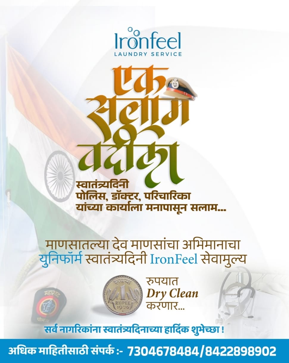 अशा या माणसातील देव माणसांचा प्रत्येक भारतीयाला अभिमान आहेच. म्हणूनच आपल्याला अभिमानास्पद असणा-या माणसातील देव माणसाची सेवा म्हणून त्यांच्या युनिफॉर्मची (वर्दीची) ड्रायक्लिनींग सुविधा १५ऑगष्ट ह्या स्वातंत्र्यदिनी केवळ एक रूपया सेवामूल्य घेऊन करण्याचे कॉर्पोरेट तसेच मध्यम वर्गात अल्पावधीतच नावारूपाला आलेल्या *आयन फिल* या लॉंड्री सेवा देणा-या संस्थेमार्फत ड्रायक्लिनींग सेवा देण्यात येणार आहे.*आयन फिल* ने गतवर्षीही ही योजना राबविली होती तेव्हा यास प्रचंड प्रतिसाद लाभला होता.