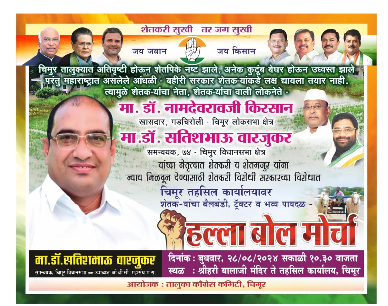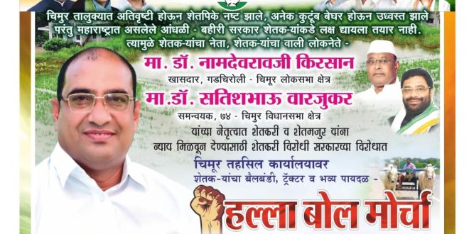 या मागण्यांचे अनुषंगाने शेतकरी न्याय यात्राचे आयोजन केलेले असून सदर कार्यक्रमाला नामदेवराव किरसान खासदार गडचिरोली-चिमूर लोकसभा,अविनाश वारजूकर सरचिटणीस महाराष्ट्र प्रदेश काँग्रेस कमिटी तथा माजी. आमदार, अध्यक्ष खनिकर्म महामंडळ (राज्यमंत्री) दर्जा,सतिश वारजूकर, समन्वयक चिमूर विधानसभा काँग्रेस तथा उपाध्यक्ष महाराष्ट्र प्रदेश ओबीसी महासंघ,विजय पाटील गावंडे तालुकाध्यक्ष काँग्रेस कमिटी चिमूर,गजानन बुटके महासचिव जिल्हा काँग्रेस कमिटी,अविनाश अगडे शहर अध्यक्ष काँग्रेस कमिटी चिमूर,विवेक कापसे उपाध्यक्ष काँग्रेस कमिटी चिमूर,शाईश वारजूकर महासचिव प्रदेश युवक काँग्रेस महाराष्ट्र यांची प्रमुख उपस्थितीमध्ये शेतकरी न्याय यात्रा व हल्लाबोल मोर्चा संपन्न होणार असून शेतकऱ्यांचे न्याय, हक्कासाठी होणाऱ्या न्याय मोर्चात सर्व चिमूर तालुक्यातील शेतकरी बंधू- भगिनींनी मोठ्या संख्येने उपस्थित राहावे असे आव्हान चिमूर काँग्रेस कमिटीच्या माध्यमातून करण्यात आलेले आहे.