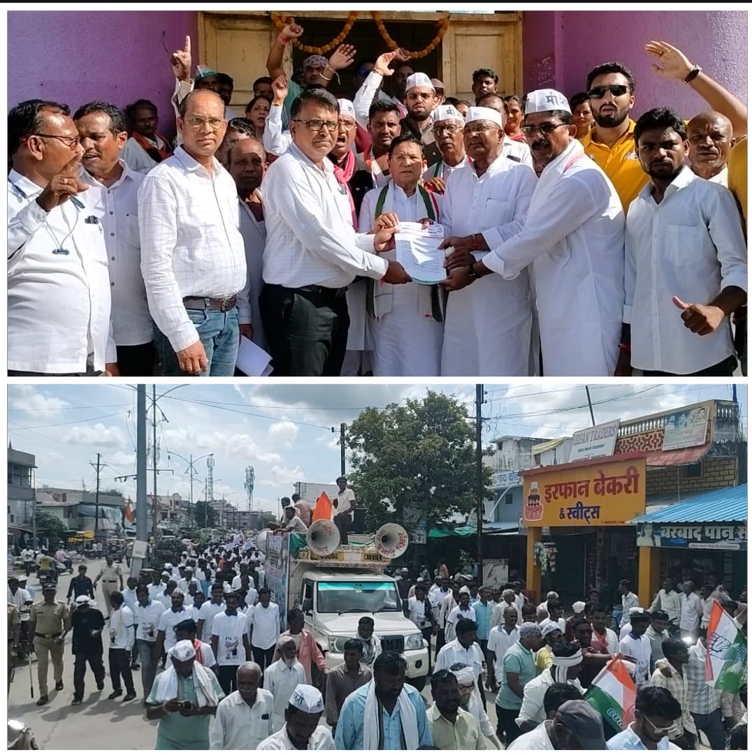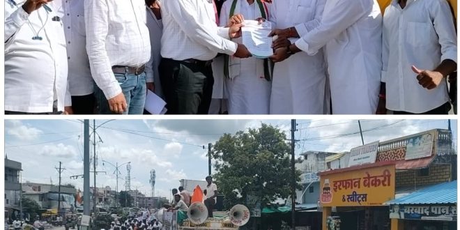 चिमूर :- चिमूर तालुका काँग्रेस कमिटीच्या वतीने माजी जिल्हा परिषद अध्यक्ष डॉ.सतिश वारजूकर यांचे नेतृत्वात बैलबंडी, ट्रॅक्टर सहित हजारो शेतकऱ्यांच्या उपस्थितीत तहसील कार्यालय चिमूर वर हल्ला बोल मोर्चा काढण्यात आला कामावर असलेल्या मजुरांचे व कुशल कामांचे पैसे तात्काळ देण्यात यावे. वन जमिनींचे पट्टे लाभार्थ्यांना लवकरात-लवकर देण्यात यावे. घरकुल योजनांचे पैसे जराही विलंब न करता लाभार्थ्यांना लवकर देण्यात यावे.