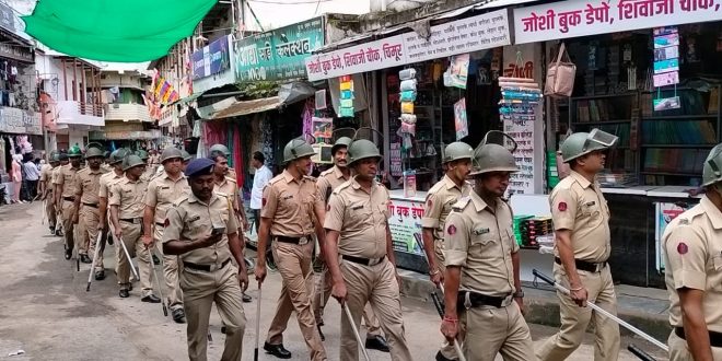 चिमूर :- चिमूर शहरासहित तालुक्यात शांतता सुव्यवस्था प्रस्थापित व्हावी. आणि आगामी होणारे सन उत्सव शांततेत पार पाडावे यासाठी बंदोबस्त करण्यासाठी चिमूर पोलिस नेहमी सज्ज असतात. त्याच अनुषंगाने गणेशोत्सव. ईद ए मिलाद निमित्त चिमूर पोलिसांनी रुठ मार्च काढला.या रूट मार्चला हुतात्मा स्मारक चिमूर येथून सुरुवात झाली.