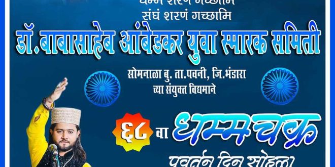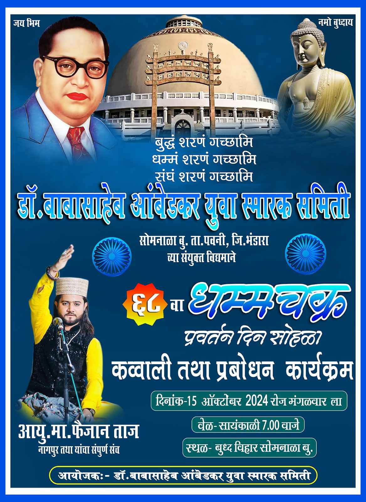 68 व्या धम्मचक्र प्रवर्तन दिन सोहळ्याचे निमित्ताने सुप्रसिद्ध कव्वाल फैजान ताज यांची कव्वाली तथा प्रबोधन कार्यक्रमाचे आयोजन करण्यात आले आहे.प्रबोधन कार्यक्रमाला जास्तीत जास्त जनतेनी उपस्थित राहण्याचे आवाहन डॉ.बाबासाहेब आंबेडकर युवा स्मारक समितीचे पदाधिकारी त्याचप्रमाणे सोमनाळा ( बुज.) येथील ग्रामवाशी यांनी केले आहे.