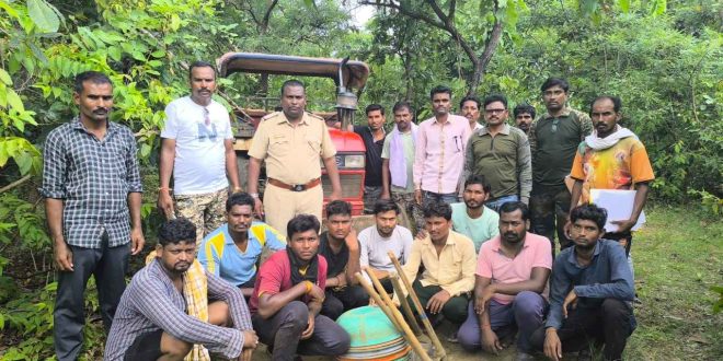 चिमूर :- चिमूर वनपरिक्षेत्र शंकरपूर उपवन क्षेत्रातील नवतळा बीटातील संरक्षित वनामध्ये रेती भरलेले ट्रॅक्टर जप्त करण्यात आलेले आहे. ट्रॅक्टर मालक व मजुरावर वन कायद्यांतर्गत गुन्हे नोंद करण्यात आले आहे. ही कार्यवाही मंगळवारी दुपारी करण्यात आली असून मौजा नवतळा बीटातील महारमजरा येथे गट क्रमांक 468 मध्ये वन कर्मचारी गस्त करीत असतांना ट्रॅक्टरचा आवाज आला सर्व कर्मचारी जवळ जाऊन पाहिले असता त्या ट्रॅक्टरमध्ये रेती भरून आढळून आले संरक्षित वनामधून चोरून नेणे हे वन कायद्यानं अंतर्गत गुन्हा असल्याने ट्रॅक्टर मालक व चालक आणि हमाल यांच्यावर गुन्हे नोंद करण्यात आले आहे.