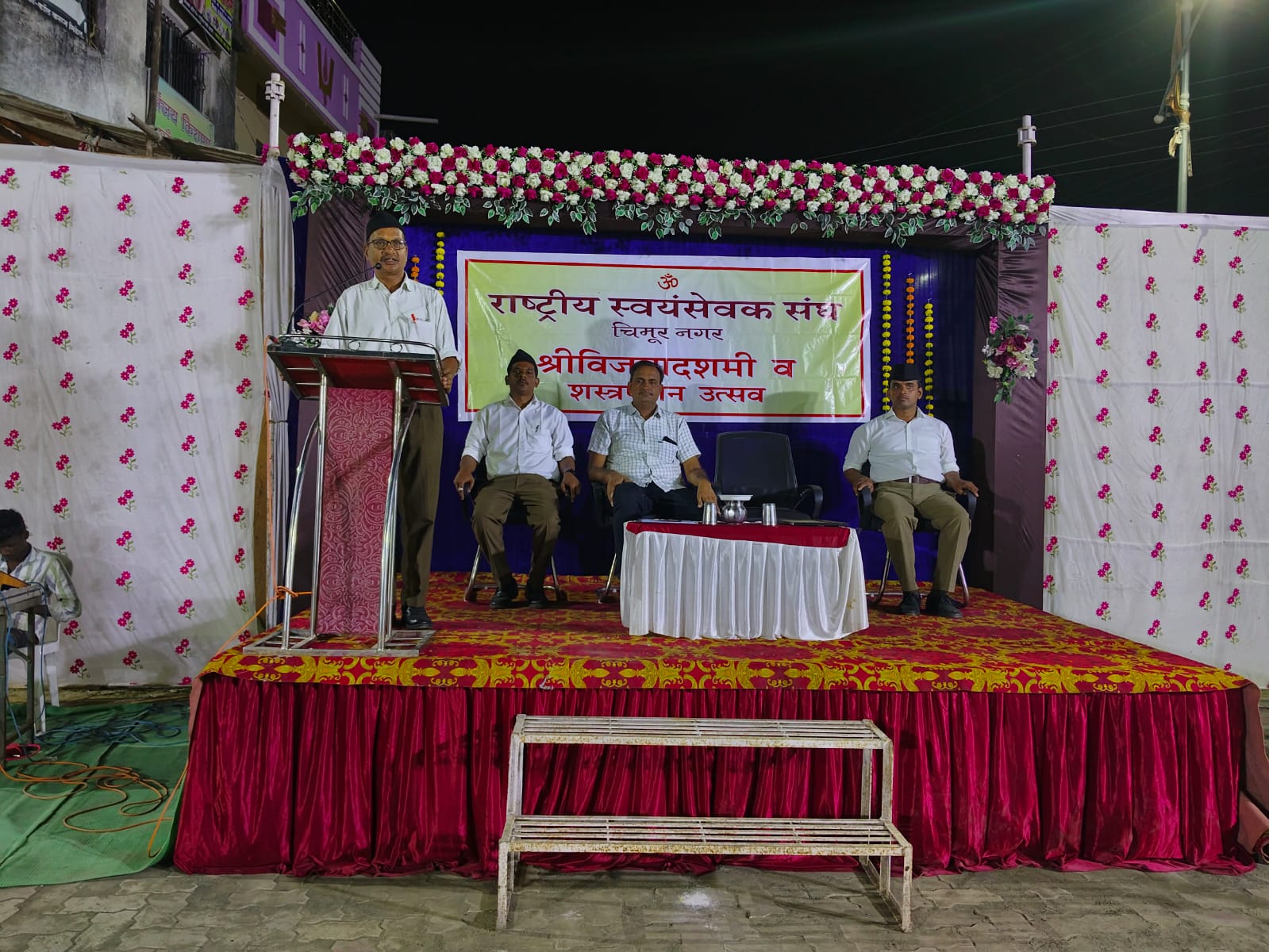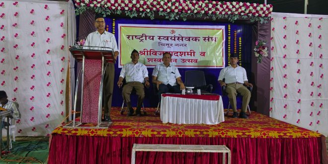 चिमूर :- राष्ट्रीय स्वयंसेवक संघ चिमूर नगराचा श्री विजयादशमी व शस्त्रपूजन उत्सव २० ऑक्टोंबर २०२४ रोज रविवारला श्री.बालाजी देवस्थान चिमुरच्या पटांगणात पार पडला.व्यासपीठावर प्रमुख अतिथी श्री.दिनेशजी कठाणे प्रतिष्ठित व्यापारी,वक्ते श्री.सुनीलजी मेंढे ,तालुका कार्यवाह परागजी बोरकर, नगर कार्यवाह श्री.समीरजी माकोडे हे प्रामुख्याने उपस्थित होते.शस्त्र पूजनाने उत्सवाची सुरुवात झाली स्वयंसेवकांनी शारीरिक प्रात्यक्षिक दंड,नियुद्ध,समता,योगासने, सांघिक व्यायाम योग,सांघिक गीत,सादर केले. कधी काळी भारत देशाकडे बघण्याचा दृष्टीकोन वेगळा होता,देशावर अनेक विदेशी आक्रांतानी आक्रमण केले व या भुमीला पराभूत करत राहीले पण हिंदू समाजाचे मुळ घट्ट असल्याने परकीयांना जास्त काळ टिकु दिले नाही.