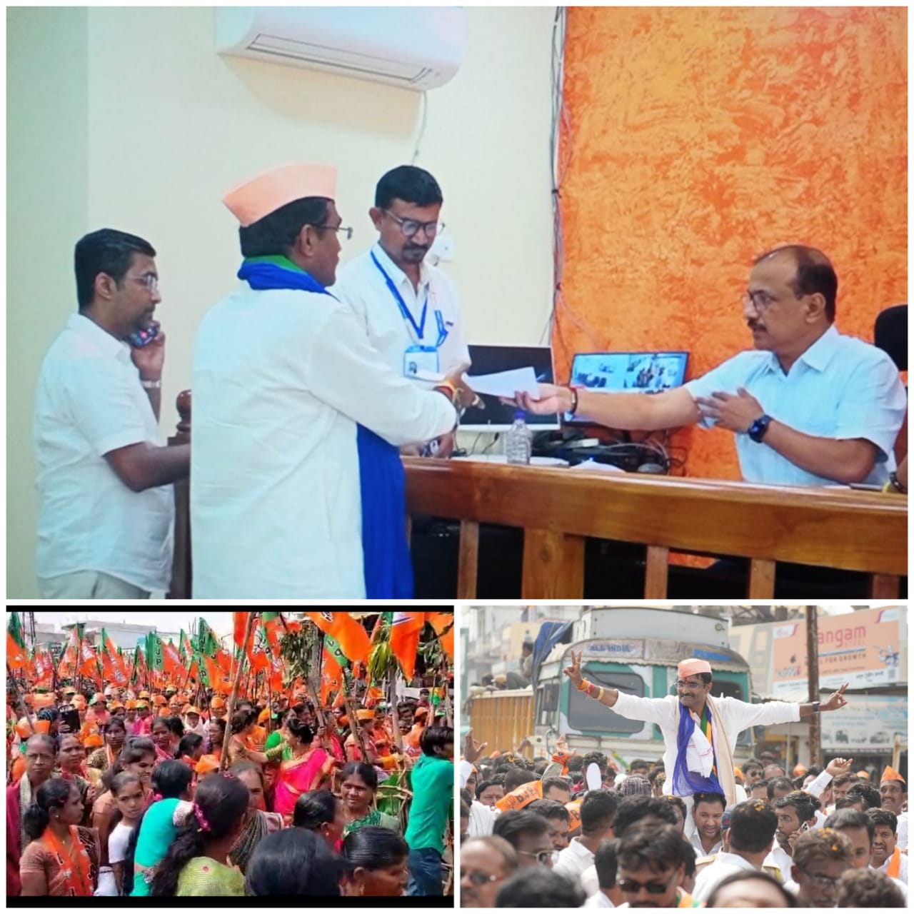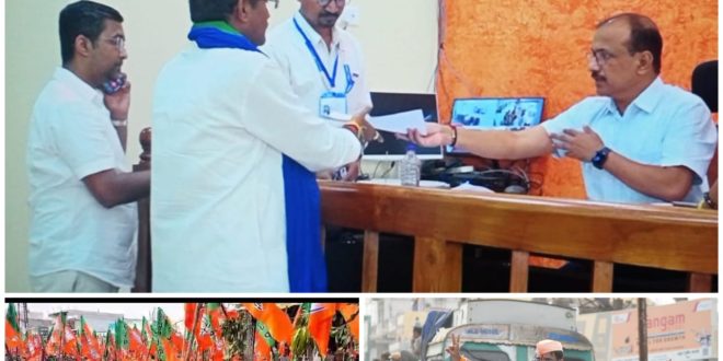 चिमूर :- चिमूर विधानसभेचे आमदार बंटी भांगडीया यांनी जोरदार शक्ती प्रदर्शन करीत उपविभागीय अधिकारी कार्यालय चिमूर येथे हजारो नागरिकांच्या (समर्थकांच्या) उपस्थितीत उमेदवारी अर्ज दाखल केला. राज्यात विधानसभा निवडणुकांचे बिगुल वाजले आहेत. 22 ऑक्टोंबर पासून उमेदवारी अर्ज दाखल करणे सुरू झाले आहेत. भारतीय जनता पार्टीच्या पहिल्याच यादीत चिमूरचे आमदार बंटी भांगडीया 2014 पासून चिमूर विधानसभा क्षेत्राचे आमदार आहेत. 2024 सार्वत्रिक विधानसभा निवडणुकीकरिता त्यांनी आज दिनांक 24 ऑक्टोंबरला चिमूर क्रांती नगरीचे आराध्य दैवत श्रीहरी बालाजी महाराज यांचे दर्शन घेत नेहरू विद्यालय चिमूरच्या पटांगनातून बैलबंडी वर रॅलीच्या माध्यमातून जोरदार शक्ती प्रदर्शन करीत निवडणूक निर्णय अधिकारी तथा उपविभागीय अधिकारी कार्यालय चिमूर येथे माजी खासदार अशोक नेते. भाजपा नेते. वसंत वारजूकर. डॉ श्याम हटवादे. राजू दैवतले. राजू झाडे. नीलम राचलवार. मनीष तुंपल्लीवार. माया ननावरे यांचे उपस्थित नामांकन दाखल केले.