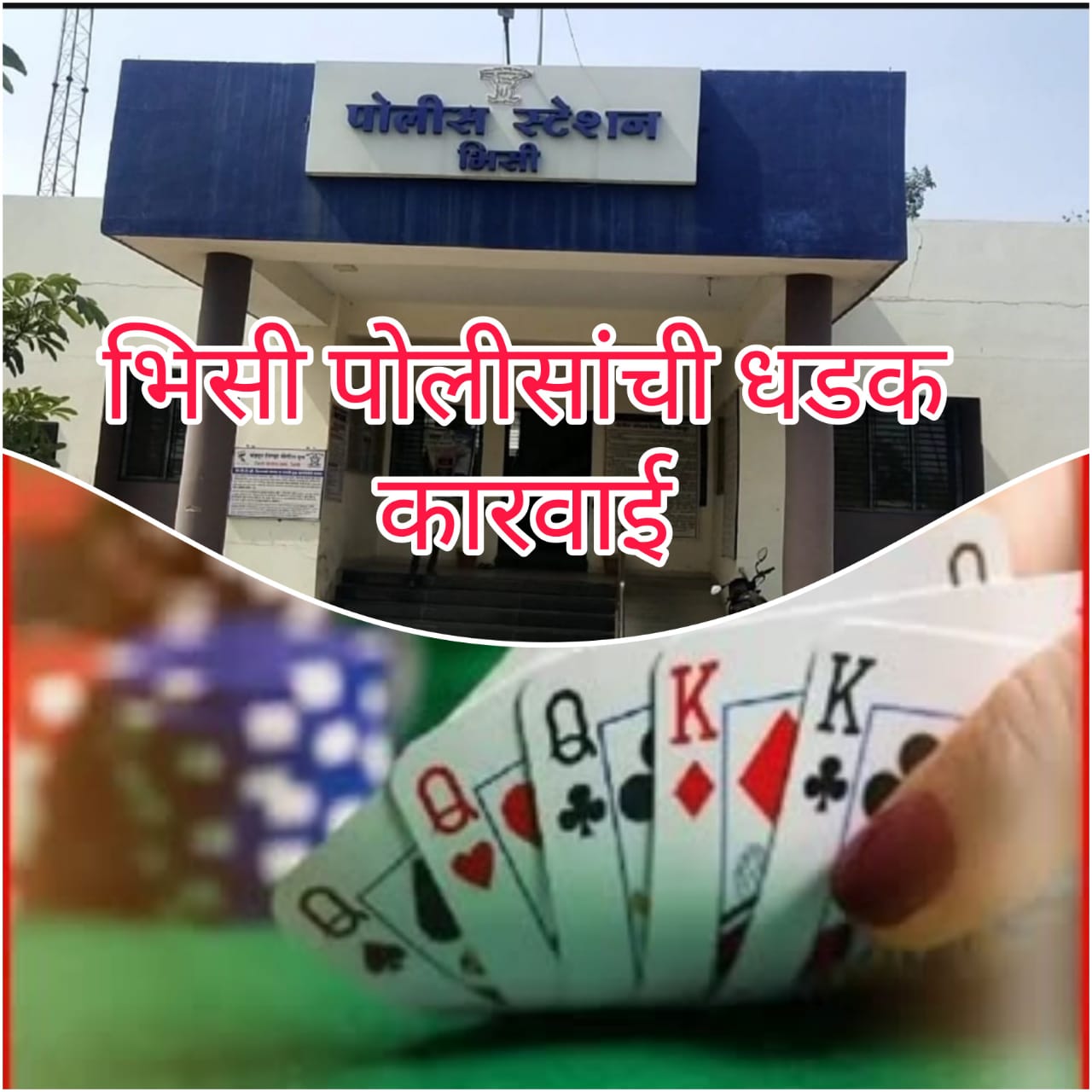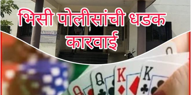चिमूर/भिसी :- भिसी पोलीसांना बातमीदार मार्फत गोपनीय माहिती मिळाली असता भिसी पोलीस स्टेशनचे ठाणेदार चांदे यांच्या मार्गदर्शनात पोस्ट मधील महिला पोलिस उपनिरीक्षक शुभांगी पाटील, पोलीस उपनिरीक्षक रविंद्र वाघ, सहाय्यक फौजदार भास्कर आत्राम, दिलीप वाघमारे, पोलीस अंमलदार लोकेश खोब्रागडे,मनोज गायकवाड असे पथक तयार करून मिळालेल्या माहितीनुसार भिसी येथील जंगल परिसरात सापळा रचून धाड (रेड) टाकली असता घटनास्थळावरून ५२ ताश पत्त्यावर हार जीतचा जुगार खेळ सुरू होता.