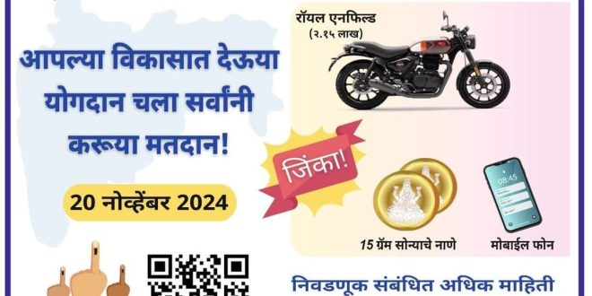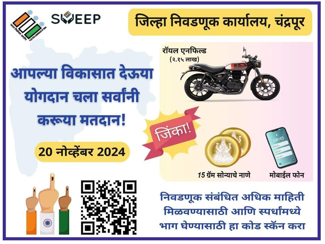 20 नोव्हेंबर 2024 रोजी महाराष्ट्र सार्वत्रिक निवडणुकीकरीता मतदान होणार आहे. यात मतदारांनो तुमचे मत द्या आणि लकी ड्रॉमध्ये आकर्षक बक्षिसे जिंकण्याच्या संधीचा फायदा घ्या, असे आवाहन जिल्हा प्रशासनाने केले आहे. लकी ड्रॉद्वारे काढण्यात येणा-या पहिल्या क्रमांकाचे बक्षीस आहे 2.15 लाखांची रॉयल एनफिल्ड बुलेट (प्रादेशिक परिवहन कार्यालयाचा आणि विमा खर्च समाविष्ट). सदर बाईक सध्या विसापूर येथील अटलबिहारी वाजपेयी बोटॅनिकल गार्डनमध्ये प्रदर्शित करण्यात आली आहे. इतर बक्षिसांमध्ये 15 ग्राम सोन्याचे नाणे, आणि एस-23, फाईव्ह जी सॅमसंग गॅलक्सी फोनचा समावेश आाहे.