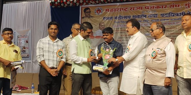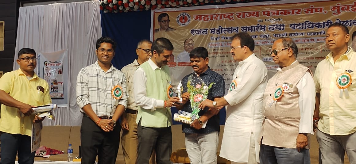 चंद्रपूर :- महाराष्ट्र राज्य पत्रकार संघ मुंबई हा सर्वात मोठा पत्रकार संघ असून महाराष्ट्र राज्य या पत्रकार संघाचे ५० हजार पदाधिकारी व सदस्य आहेत.भद्रावती,चंद्रपूर,विदर्भातील पदाधिकाऱ्यांद्वारे भद्रावती येथे,”महाराष्ट्र राज्य पत्रकार संघ मुंबई रजत मोहोत्सव समारंभ व पदाधिकारी मेळावा ३ फेब्रुवारीला,”स्वागत सेलिब्रेशन हाॅल,येथे आयोजित करण्यात आला होता.या कार्यक्रमाप्रसंगी दखल न्यूज भारतचे मुख्य संपादक प्रदीप रामटेके यांचा महाराष्ट्र राज्य पत्रकार संघाचे,”विदर्भ कुशल संघटक व उत्कृष्ट पत्रकार म्हणून मान्यवरांच्या हस्ते सन्मान करण्यात आला.