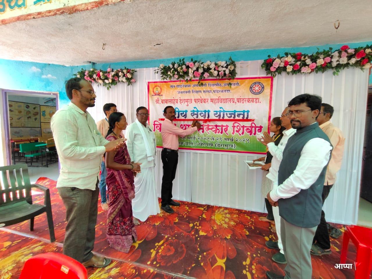 राळेगाव :- स्थानिक. बाबासाहेब देशमुख पारवेकर महाविद्यालय पांढरकवडा राष्ट्रीय सेवा योजना विशेष श्रमसंस्कार शिबीर दिनांक २३ मार्च २०२५ ते २९ मार्च २०२५ या कालावधीत दत्तक ग्राम खैरगाव देशमुख येथे आयोजीत करण्यात आले आहे. या विशेष शिबीराचे उ‌द्घाटन दिनांक २३ मार्च २०२५ रोजी संपन्न झाले. उद्घाटन समारोहाचे अध्यक्ष जनशक्ती शिक्षण संस्था पांढरकवडा चे सहसचिव सांबारेड्डी येल्टीवार हे होते तर उद्घाटक राजेंद्रजी इंगळे तहसिलदार केव्ळापूर हे होते. तर प्रमुख अतिथी महाविद्यालयाचे प्राचार्य डॉ आर. एस. खंडारे, महाविद्यालय विकास समिती सदस्य सुनिलभाऊ ठाकरे, संरपंच सौ. संगिताताई कुलसंगे, उपसरपंच विनोदभाऊ बोरतवार, सामाजिक कार्यकर्ता सतिशभाऊ ढोले, विलासभाऊ कोटनाके अध्यक्ष शाळा व्यवस्थपन समिती, ज्ञानेश्वर नैताम अध्यक्ष तंटामुक्ती समिती, त्याचबरोबर कार्यक्रम अधिकारी डॉ. पी. एम. कनाके, महीला कार्यकम अधिकारी डॉ आर.जे. महाजन, सहकार्यक्रम अधिकारी डॉ पी.जी. जोशी आणि प्रा.एन जे टेकाम तसेच महाविद्यालयातील प्राध्यापक आणि शिक्षकेतर कर्मचारी तसेच रा.से. यो. स्वयंसेवक विद्यार्थी उपस्थित होते. कार्यक्रमाची सुरवात विद्यापीठ गीताने करण्यात आली.