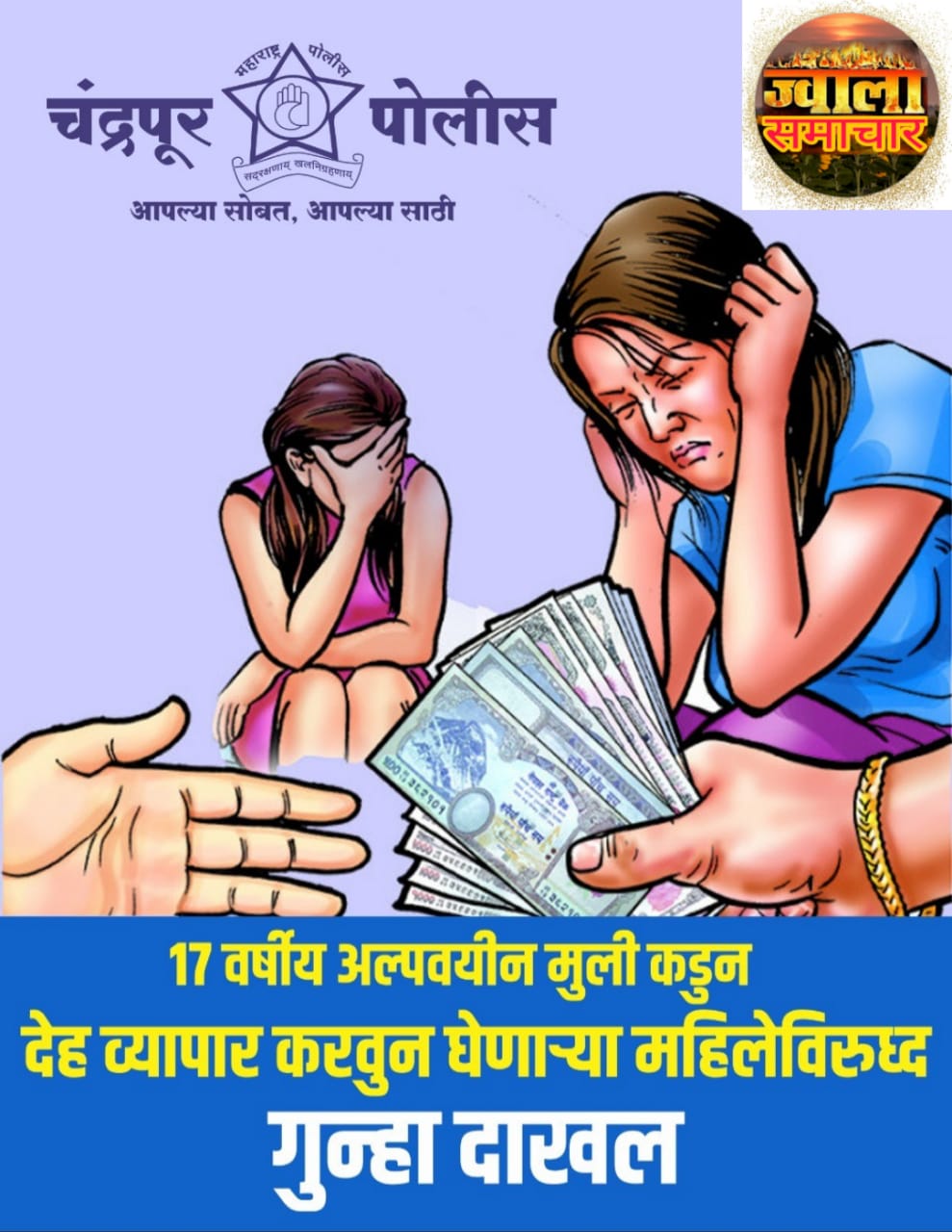 चंद्रपूर :- दिनांक १३ मे, २०२५ रोजी पोलीस ठाणे चंद्रपूर शहर हद्दीत गोपनिय माहितीचे आधारे गौतम नगर महाकाली वार्ड चंद्रपूर येथे अमीना नावाचे महिलेची खोली शोधुन पंचासमक्ष खोलीची पाहणी केली असता तेथे एक मुलगी दिसुन आल्याने तिची विचारपुस केली असता ती १७ वर्षाची असुन सदर खोली ही अमीना नावाच्या महिलेची असुन तिचे सांगनेवरुन देह व्यापार करीत असल्याचे सांगितले वरुन सदर महिला अमीना सैयद हिचे विरुध्द पोलीस स्टेशन चंद्रपूर शहर येथे अपराध कामंक १४३ (४) भारतीय न्याय संहिता सहकलम ३, ४, ५, ६ महिला व मुलींचे अनैतिक व्यापार प्रतिबंध कायद्यान्वये गुन्हा नोंदविण्यात आला आहे.