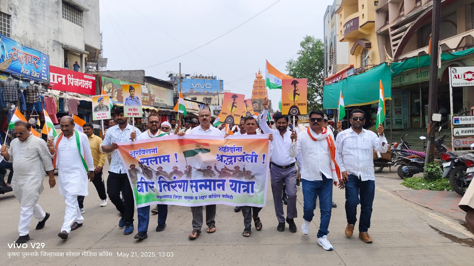 यानंतर देशाच्या सीमेवर कार्य करणाऱ्या शूर सैनिकांचा मान्यवरांच्या हस्ते सत्कार करण्यात आला. सत्कार समारंभानंतर देशभक्तीपर घोषणांनी दुमदुमलेल्या वातावरणात शहरातून तिरंगा रॅली काढण्यात आली.ही तिरंगा यात्रा “ऑपरेशन सिंदूर” मधील भारतीय लष्कराने दाखवलेल्या अद्वितीय शौर्य, धैर्य आणि राष्ट्रनिष्ठेचा गौरव करण्यासाठी आयोजित करण्यात आली होती. भारतीय लष्कर, नौदल व वायूदल यांच्या पराक्रमाला कृतज्ञतेने वंदन करत, राष्ट्रीय एकात्मतेचा संदेश देण्याचा काँग्रेस पक्षाचा हा उपक्रम होता.