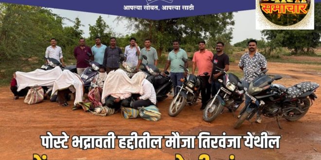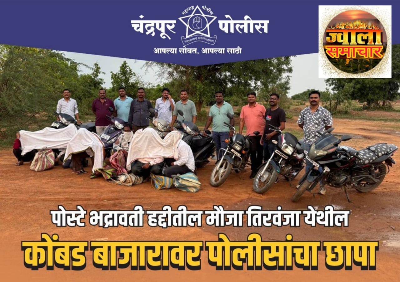 चंद्रपूर :- दिनांक २८ मे, २०२५ रोजी पोलीस स्टेशन भद्रावती हद्दीत मौजा तिरवंजा गावातील शेतालगत असलेल्या झुडपी जंगल परिसरात काही इसम कोंबडयाचा पायाला कत्या बांधुन त्याची झुंज लावुन कोंबडा जुगार खेळ खेळीत असल्याचे गोपनिय माहितीवरुन भद्रावती पोलीसांनी सदर ठिकाणी छापा टाकुन सदर ठिकाणाहुन एकुण ७ आरोपी अटक करुन त्यांचे ताब्यातुन नगदी रोख रक्कम, व कोंबळे १ मृत, १ जखमी, २ जखमी कोंबडे, दोन कात्या, सात मोटार सायकल असा एकुण ४,५९,३३०/- रुपयाचा मुद्देमाल जप्त करण्यात आला आहे.
